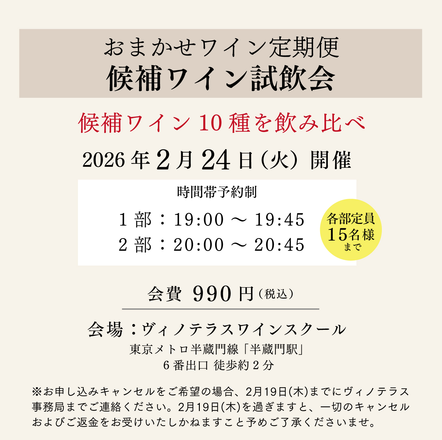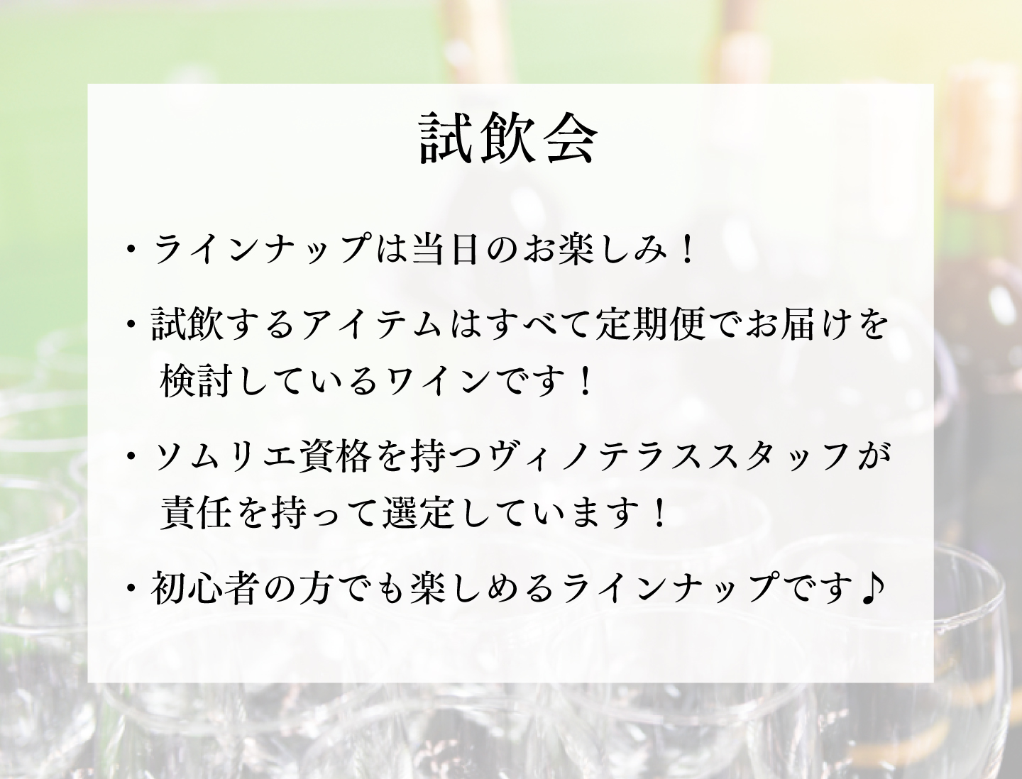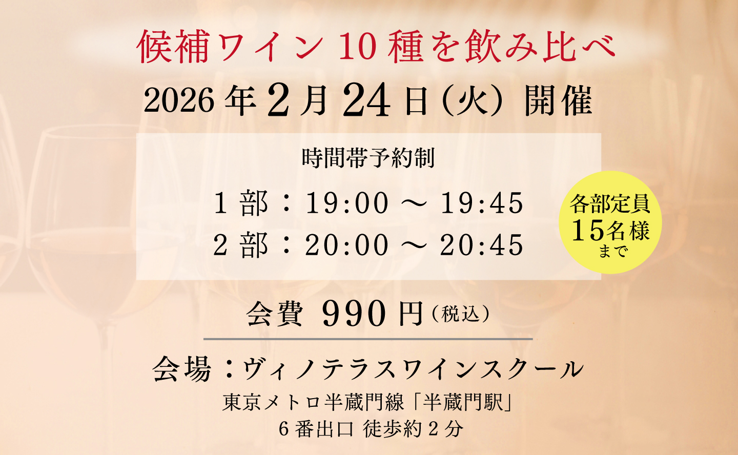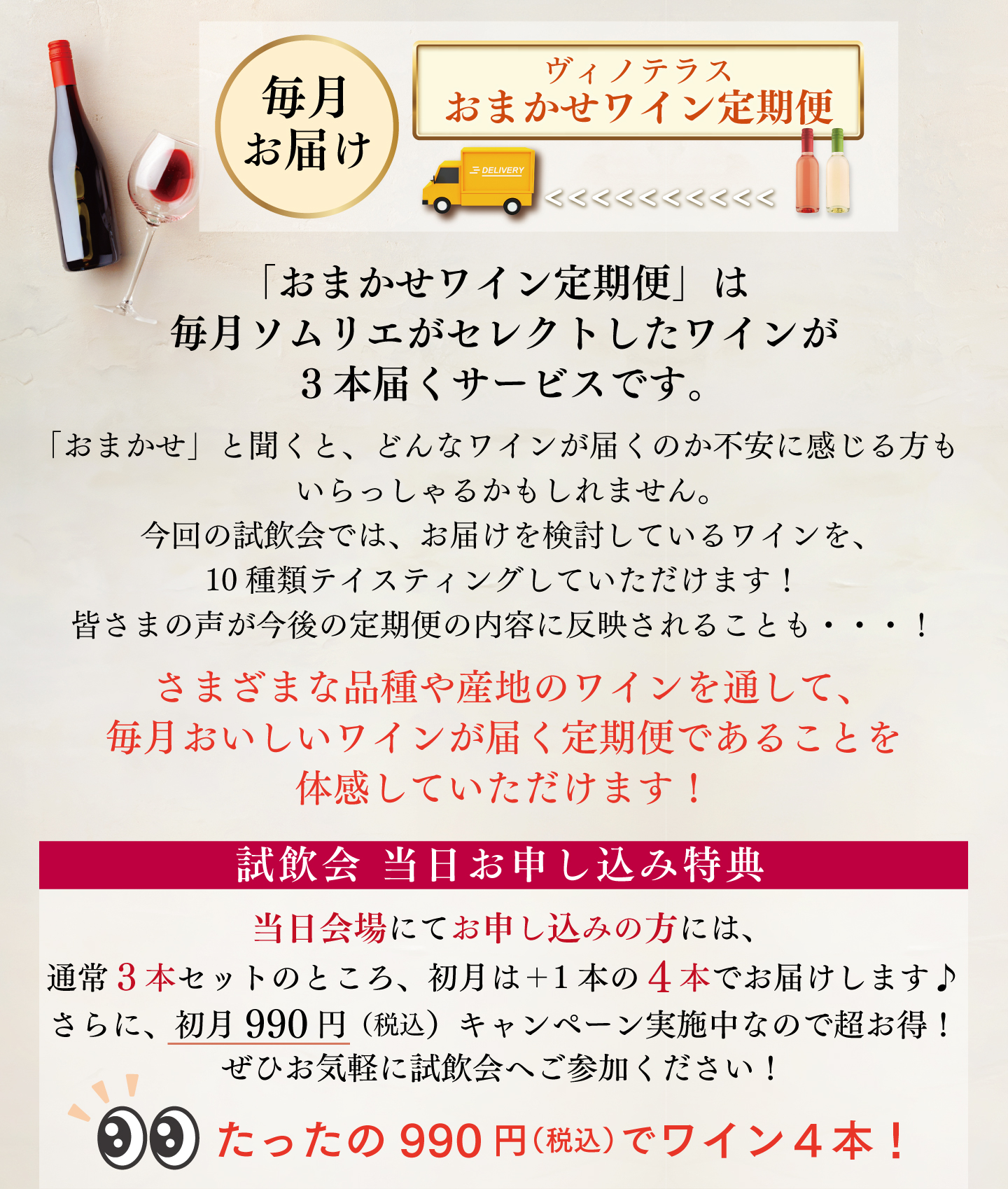 TOP イベント 【2月24日(火)開催】おまかせワイン定期便 候補ワイン試飲会 価格: ¥990 (税込) [ポイント還元 49ポイント~] 販売期間: 開催時間在庫購入1部:19:00~19:45在庫切れ 2部:20:00~20:45在庫切れ 返品についての詳細はこちら 数量: 個 開催時間在庫購入1部:19:00~19:45在庫切れ 2部:20:00~20:45在庫切れ 【2月24日(火)開催】おまかせワイン定期便 候補ワイン試飲会 お申し込みはこちらから