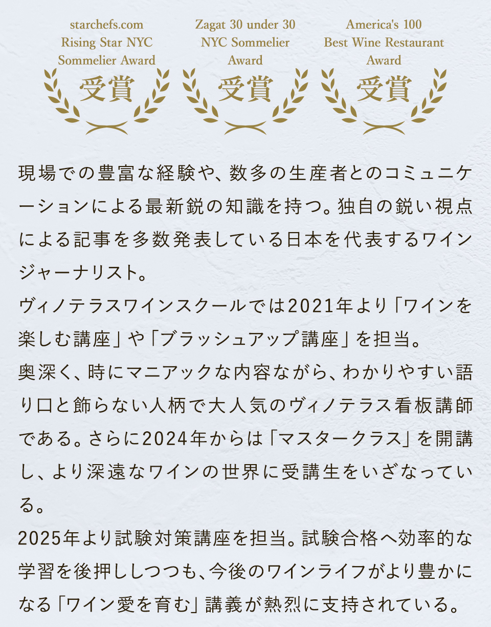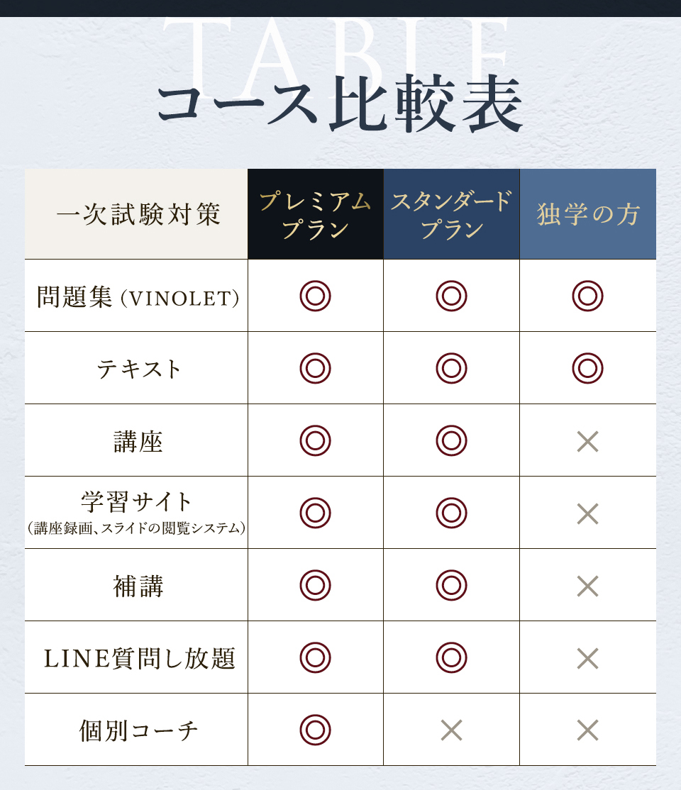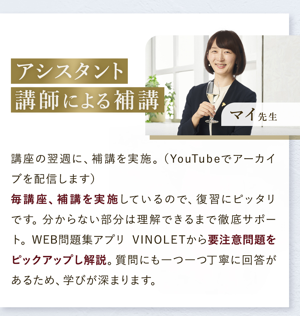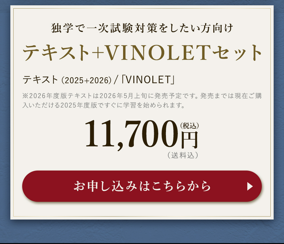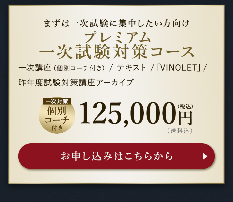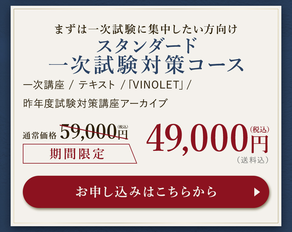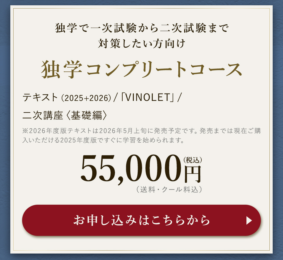 TOP ソムリエ・ワインエキスパート一次試験対策講座2026 表示切替: 写真のみ 説明付き 並び順: 標準 レビューの多い順 おすすめ商品順 新着商品順 値段の安い順 値段の高い順 名前:昇順 名前:降順 9件中1件~9件を表示 商品一覧 在庫切れ ソムリエ・ワインエキスパート試験対策無料体験講座 ¥0(税込) 【2026年度】【プレミアム】コンプリートコース(一次講座+二次講座(基礎編)+テキスト+VINOLET) ¥159,000(税込) 2026年度ソムリエ・ワインエキスパート試験対策講座 【2026年度】【プレミアム】一次試験対策講座(講座+テキスト+VINOLET) ¥125,000(税込) 2026年度ソムリエ・ワインエキスパート試験対策講座 【2026年度】【スタンダード】コンプリートコース(一次講座+二次講座(基礎編)+テキスト+VINOLET) 通常価格: ¥98,000(税込) 価格: ¥88,000(税込) 2026年度ソムリエ・ワインエキスパート試験対策講座 【2026年度】【スタンダード】一次試験対策講座(講座+テキスト+VINOLET) 通常価格: ¥59,000(税込) 価格: ¥49,000(税込) 2026年度ソムリエ・ワインエキスパート試験対策講座 【2026年度】【独学】コンプリートコース(テキスト+VINOLET+二次講座(基礎編)) ¥55,000(税込) 2026年度ソムリエ・ワインエキスパート試験対策講座 【2026年度】二次試験対策講座(基礎編) ¥44,000(税込) 2026年度ソムリエ・ワインエキスパート試験対策講座 【テキスト(2025年+2026年)】+【VINOLET】 ¥11,700(税込) 2026年度ソムリエ・ワインエキスパート試験対策講座 【2026年度】WEB問題集アプリ「VINOLET」トークン購入 ¥4,500(税込) 2026年度ソムリエ・ワインエキスパート試験対策講座 9件中1件~9件を表示