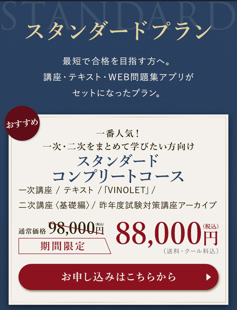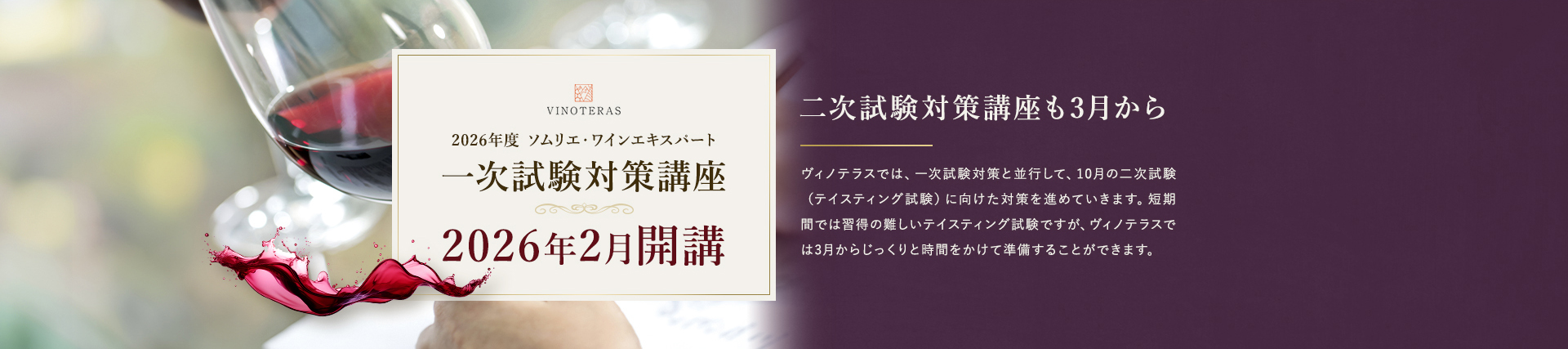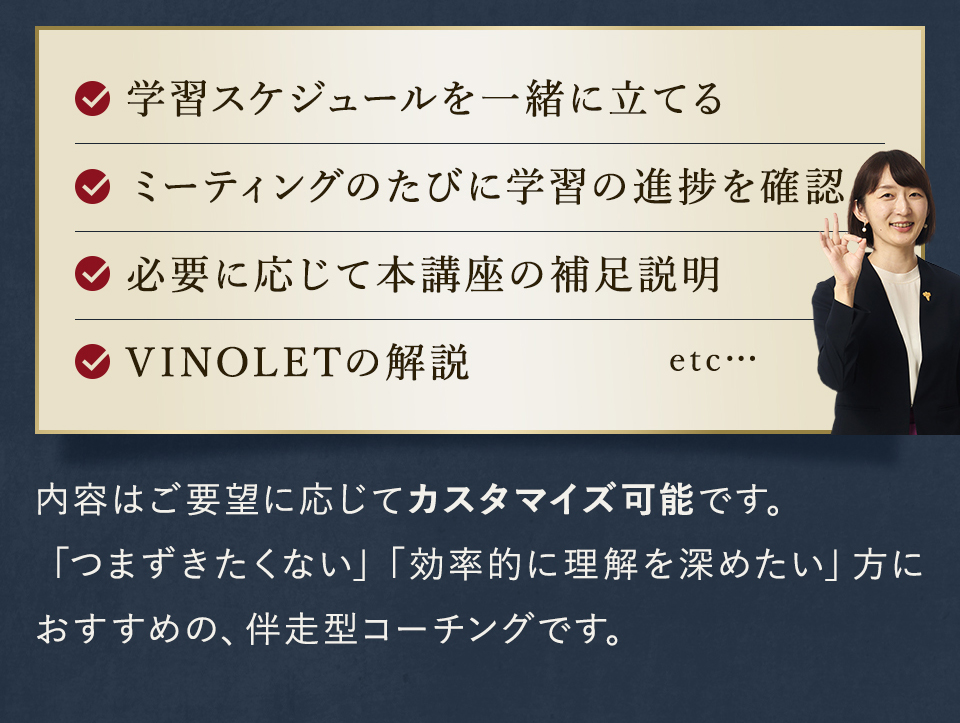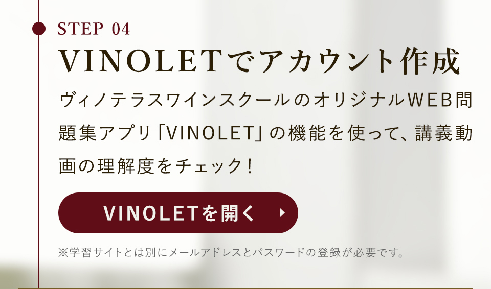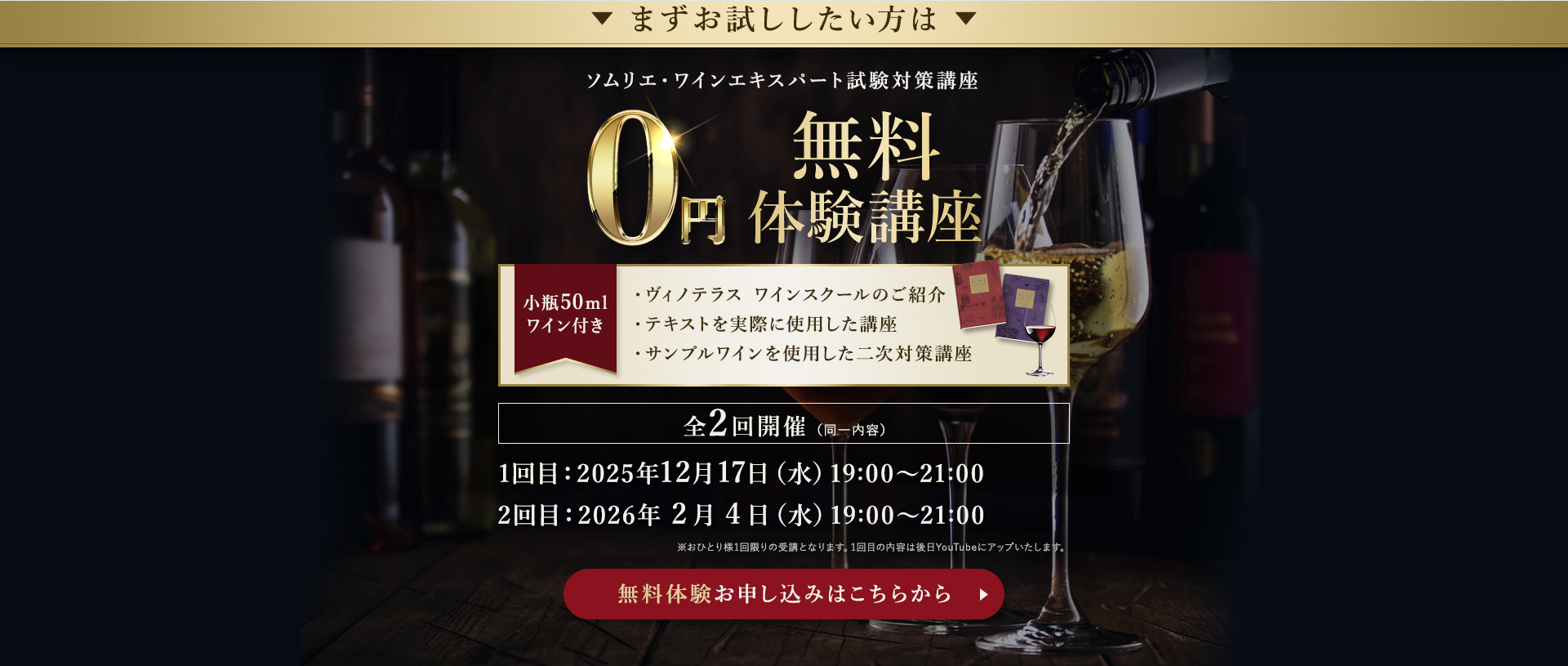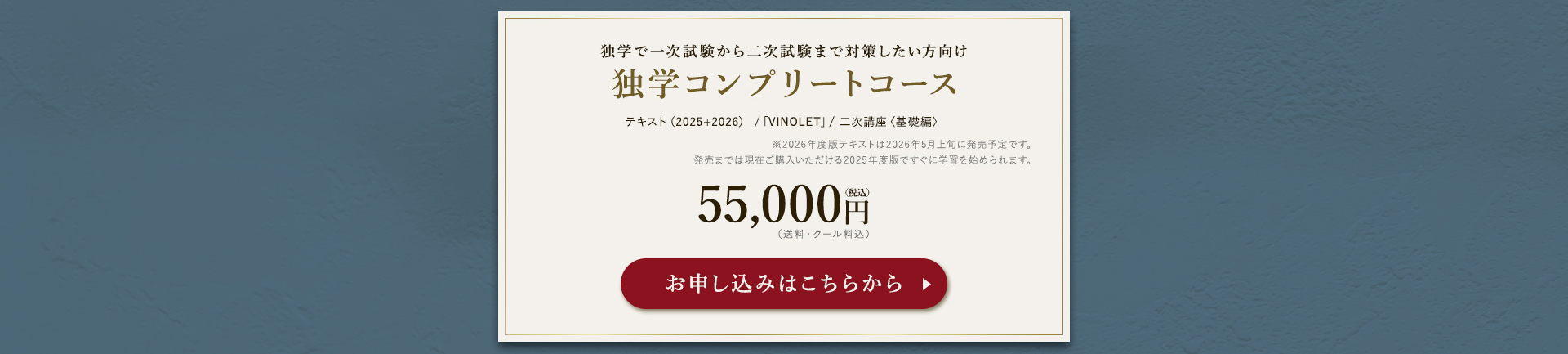 TOP ソムリエ・ワインエキスパート一次試験対策講座2026 表示切替: 写真のみ 説明付き 並び順: 標準 レビューの多い順 おすすめ商品順 新着商品順 値段の安い順 値段の高い順 名前:昇順 名前:降順 9件中1件~9件を表示 商品一覧 在庫切れ ソムリエ・ワインエキスパート試験対策無料体験講座 ¥0(税込) 【2026年度】【プレミアム】コンプリートコース(一次講座+二次講座(基礎編)+テキスト+VINOLET) ¥159,000(税込) 2026年度ソムリエ・ワインエキスパート試験対策講座 【2026年度】【プレミアム】一次試験対策講座(講座+テキスト+VINOLET) ¥125,000(税込) 2026年度ソムリエ・ワインエキスパート試験対策講座 【2026年度】【スタンダード】コンプリートコース(一次講座+二次講座(基礎編)+テキスト+VINOLET) 通常価格: ¥98,000(税込) 価格: ¥88,000(税込) 2026年度ソムリエ・ワインエキスパート試験対策講座 【2026年度】【スタンダード】一次試験対策講座(講座+テキスト+VINOLET) 通常価格: ¥59,000(税込) 価格: ¥49,000(税込) 2026年度ソムリエ・ワインエキスパート試験対策講座 【2026年度】【独学】コンプリートコース(テキスト+VINOLET+二次講座(基礎編)) ¥55,000(税込) 2026年度ソムリエ・ワインエキスパート試験対策講座 【2026年度】二次試験対策講座(基礎編) ¥44,000(税込) 2026年度ソムリエ・ワインエキスパート試験対策講座 【テキスト(2025年+2026年)】+【VINOLET】 ¥11,700(税込) 2026年度ソムリエ・ワインエキスパート試験対策講座 【2026年度】WEB問題集アプリ「VINOLET」トークン購入 ¥4,500(税込) 2026年度ソムリエ・ワインエキスパート試験対策講座 9件中1件~9件を表示