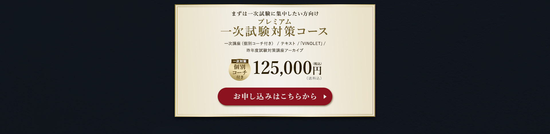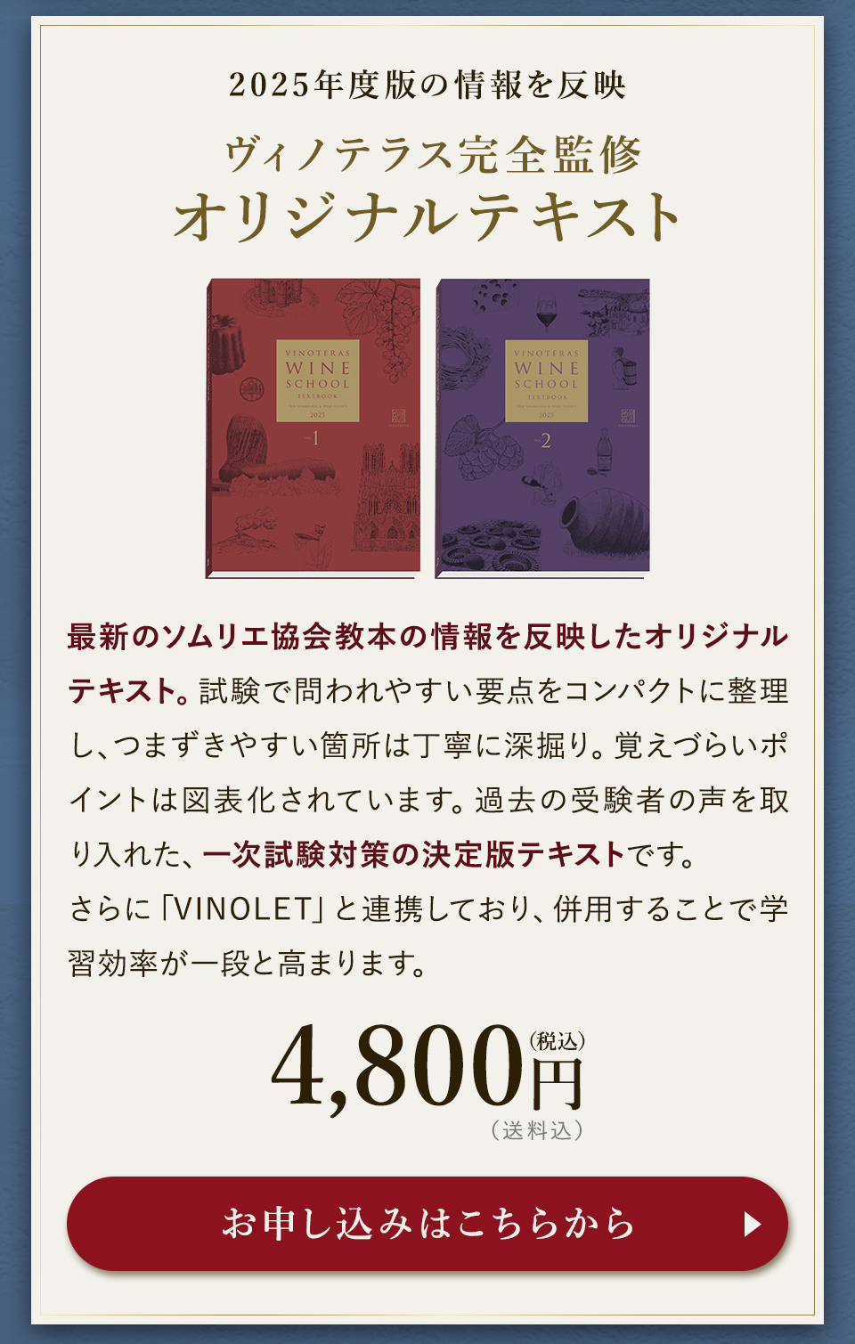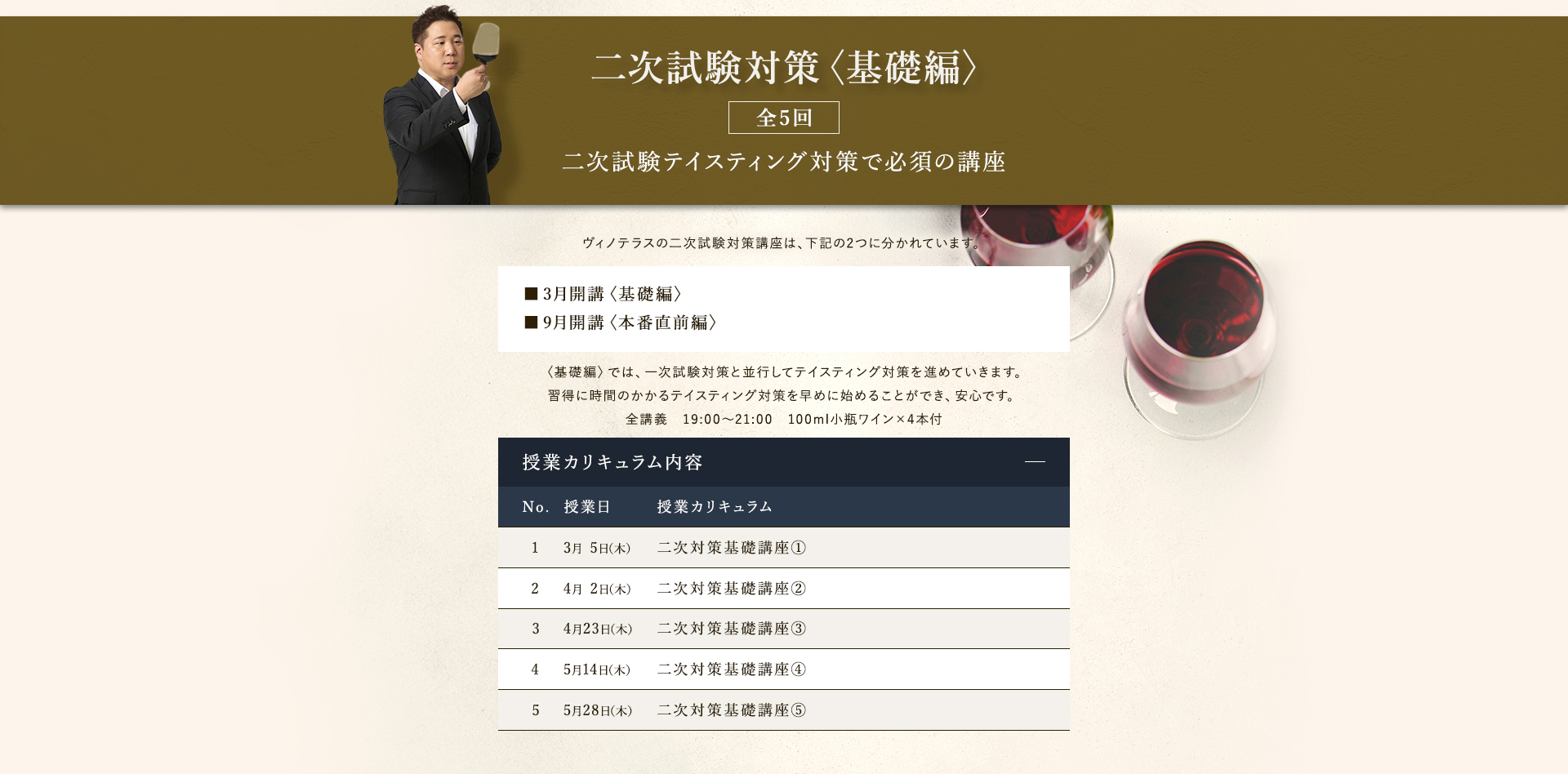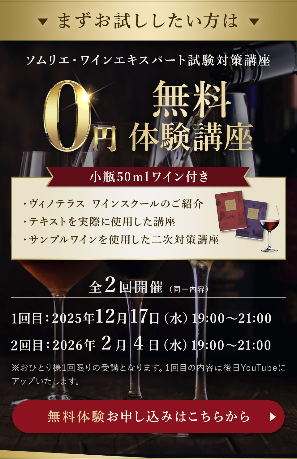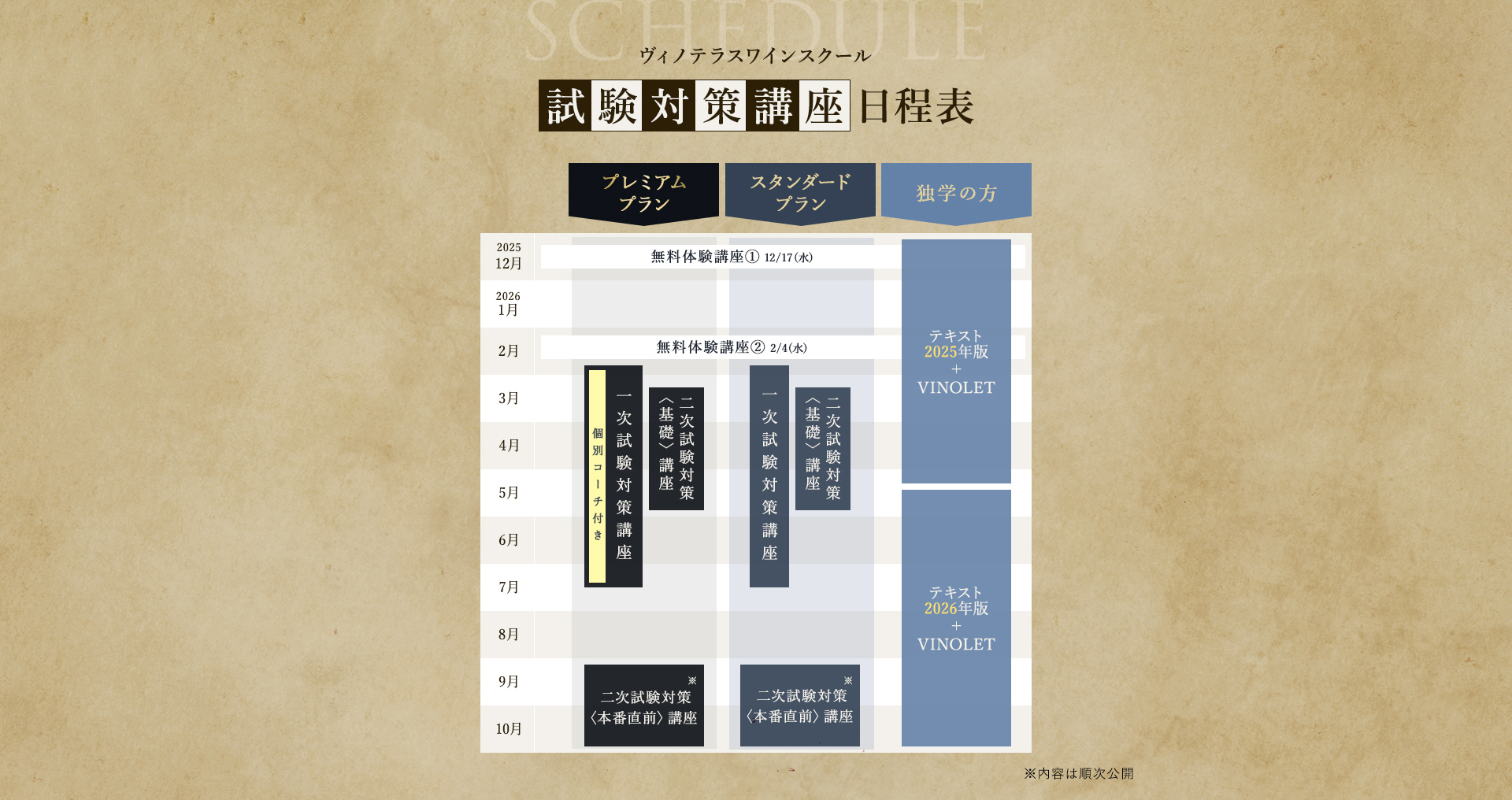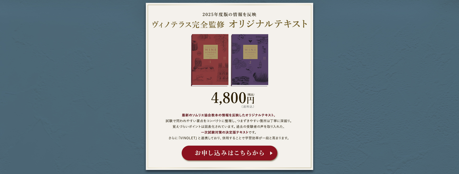 TOP ソムリエ・ワインエキスパート一次試験対策講座2026 表示切替: 写真のみ 説明付き 並び順: 標準 レビューの多い順 おすすめ商品順 新着商品順 値段の安い順 値段の高い順 名前:昇順 名前:降順 9件中1件~9件を表示 商品一覧 在庫切れ ソムリエ・ワインエキスパート試験対策無料体験講座 ¥0(税込) 【2026年度】【プレミアム】コンプリートコース(一次講座+二次講座(基礎編)+テキスト+VINOLET) ¥159,000(税込) 2026年度ソムリエ・ワインエキスパート試験対策講座 【2026年度】【プレミアム】一次試験対策講座(講座+テキスト+VINOLET) ¥125,000(税込) 2026年度ソムリエ・ワインエキスパート試験対策講座 【2026年度】【スタンダード】コンプリートコース(一次講座+二次講座(基礎編)+テキスト+VINOLET) 通常価格: ¥98,000(税込) 価格: ¥88,000(税込) 2026年度ソムリエ・ワインエキスパート試験対策講座 【2026年度】【スタンダード】一次試験対策講座(講座+テキスト+VINOLET) 通常価格: ¥59,000(税込) 価格: ¥49,000(税込) 2026年度ソムリエ・ワインエキスパート試験対策講座 【2026年度】【独学】コンプリートコース(テキスト+VINOLET+二次講座(基礎編)) ¥55,000(税込) 2026年度ソムリエ・ワインエキスパート試験対策講座 【2026年度】二次試験対策講座(基礎編) ¥44,000(税込) 2026年度ソムリエ・ワインエキスパート試験対策講座 【テキスト(2025年+2026年)】+【VINOLET】 ¥11,700(税込) 2026年度ソムリエ・ワインエキスパート試験対策講座 【2026年度】WEB問題集アプリ「VINOLET」トークン購入 ¥4,500(税込) 2026年度ソムリエ・ワインエキスパート試験対策講座 9件中1件~9件を表示