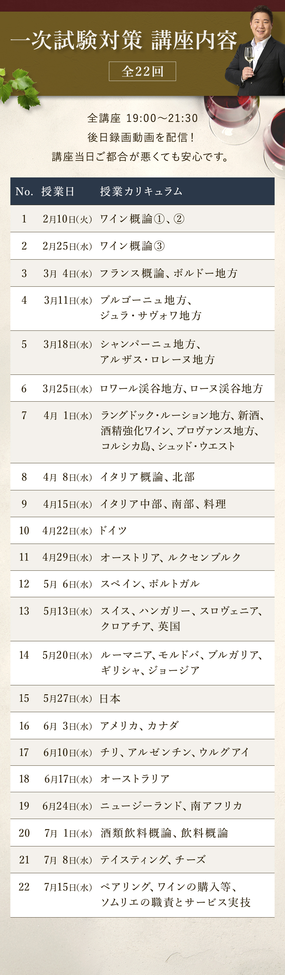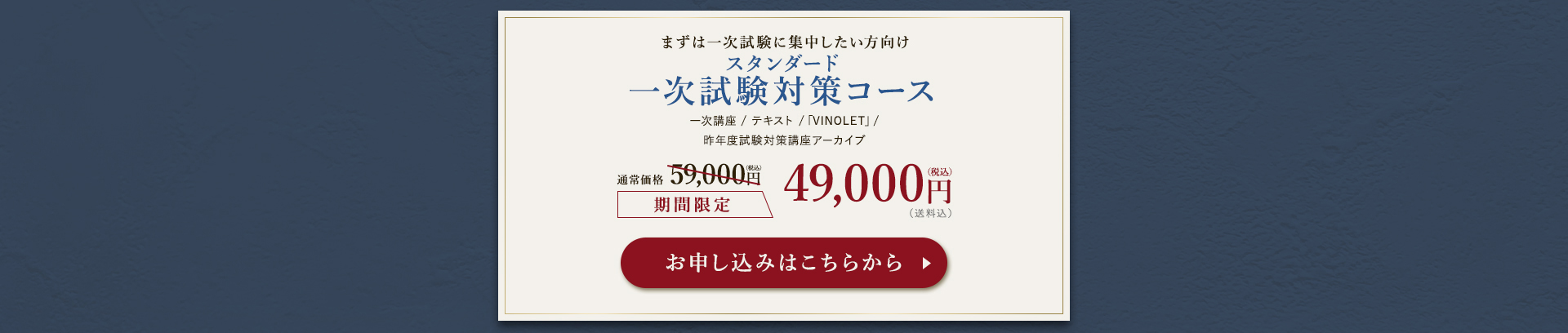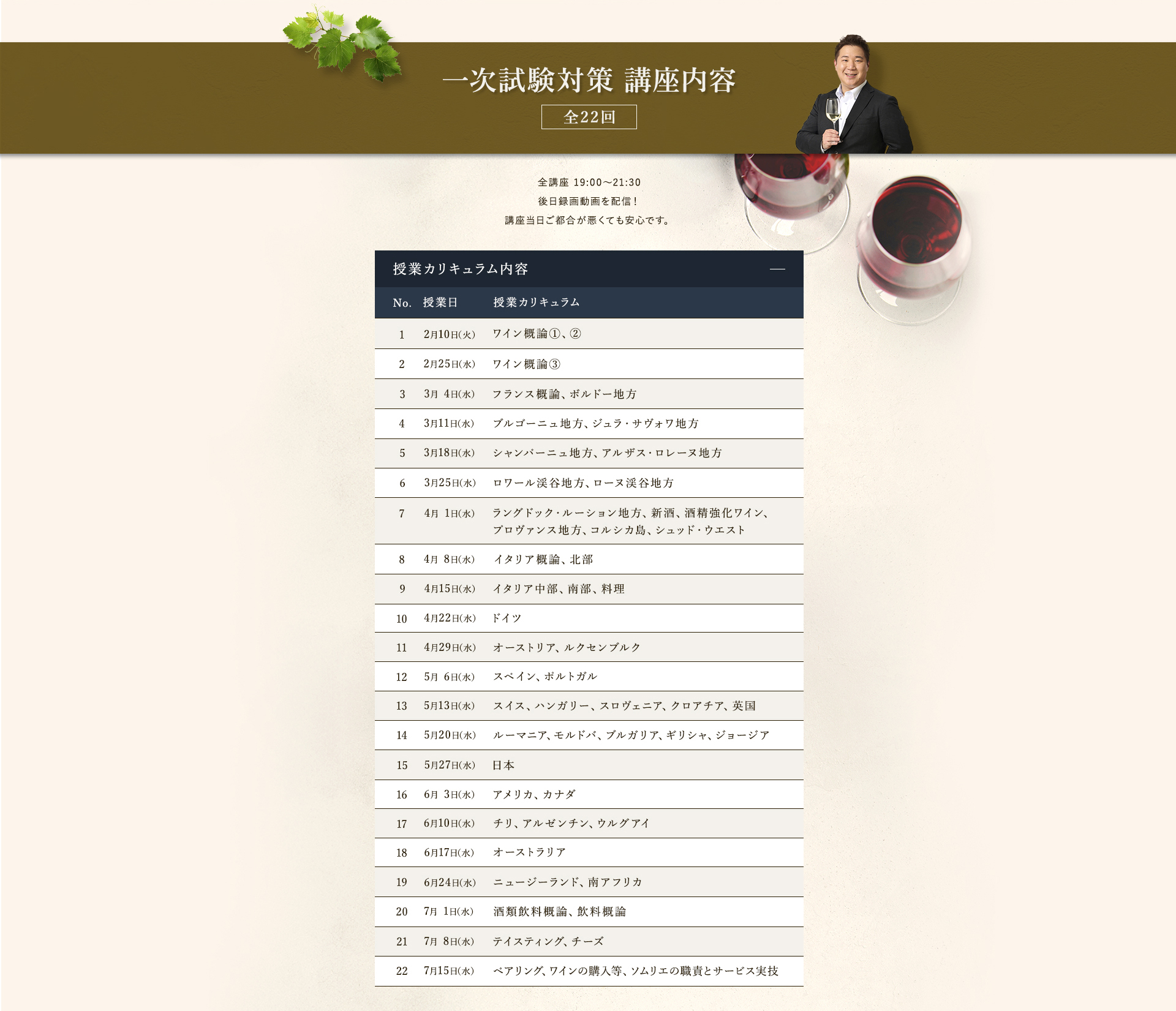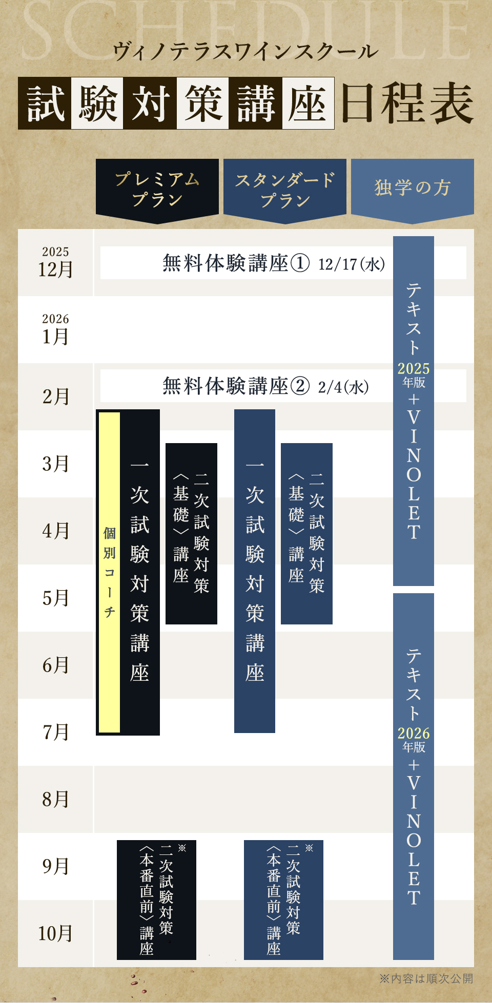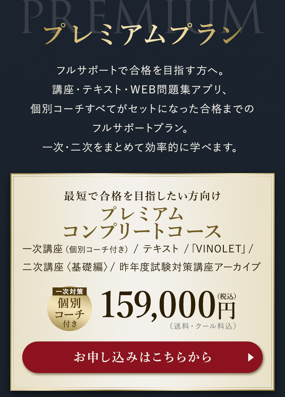 TOP ソムリエ・ワインエキスパート一次試験対策講座2026 表示切替: 写真のみ 説明付き 並び順: 標準 レビューの多い順 おすすめ商品順 新着商品順 値段の安い順 値段の高い順 名前:昇順 名前:降順 9件中1件~9件を表示 商品一覧 在庫切れ ソムリエ・ワインエキスパート試験対策無料体験講座 ¥0(税込) 【2026年度】【プレミアム】コンプリートコース(一次講座+二次講座(基礎編)+テキスト+VINOLET) ¥159,000(税込) 2026年度ソムリエ・ワインエキスパート試験対策講座 【2026年度】【プレミアム】一次試験対策講座(講座+テキスト+VINOLET) ¥125,000(税込) 2026年度ソムリエ・ワインエキスパート試験対策講座 【2026年度】【スタンダード】コンプリートコース(一次講座+二次講座(基礎編)+テキスト+VINOLET) 通常価格: ¥98,000(税込) 価格: ¥88,000(税込) 2026年度ソムリエ・ワインエキスパート試験対策講座 【2026年度】【スタンダード】一次試験対策講座(講座+テキスト+VINOLET) 通常価格: ¥59,000(税込) 価格: ¥49,000(税込) 2026年度ソムリエ・ワインエキスパート試験対策講座 【2026年度】【独学】コンプリートコース(テキスト+VINOLET+二次講座(基礎編)) ¥55,000(税込) 2026年度ソムリエ・ワインエキスパート試験対策講座 【2026年度】二次試験対策講座(基礎編) ¥44,000(税込) 2026年度ソムリエ・ワインエキスパート試験対策講座 【テキスト(2025年+2026年)】+【VINOLET】 ¥11,700(税込) 2026年度ソムリエ・ワインエキスパート試験対策講座 【2026年度】WEB問題集アプリ「VINOLET」トークン購入 ¥4,500(税込) 2026年度ソムリエ・ワインエキスパート試験対策講座 9件中1件~9件を表示