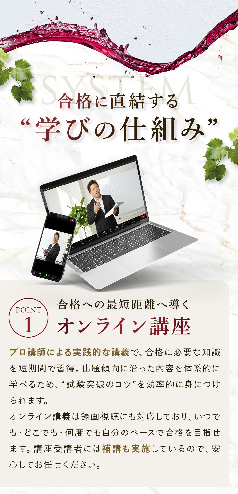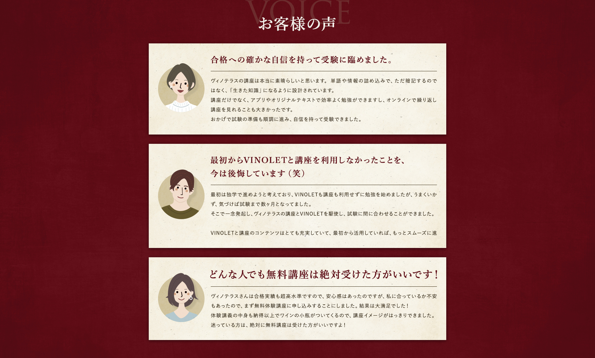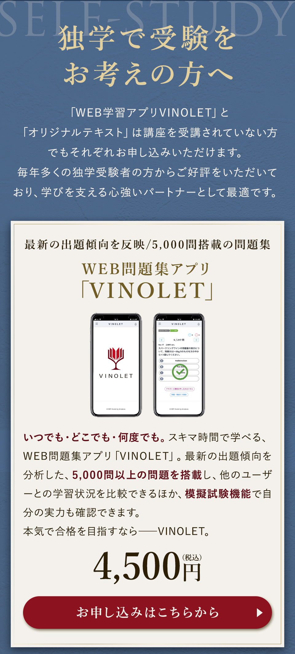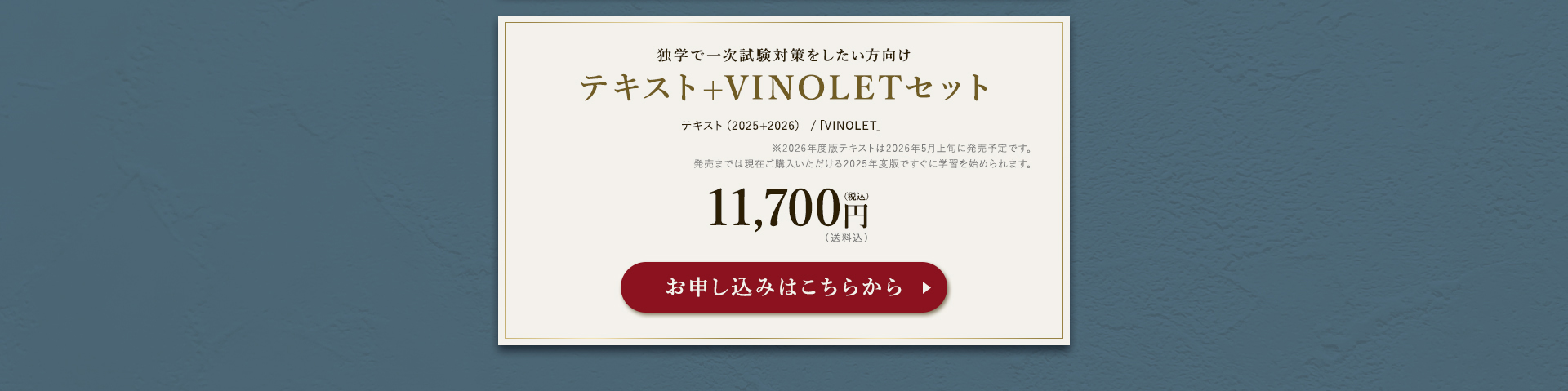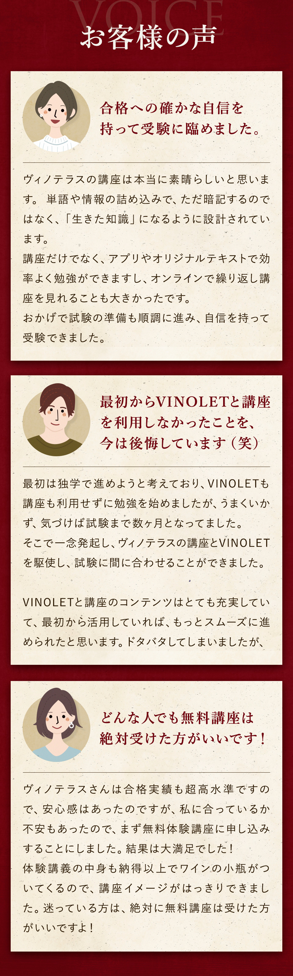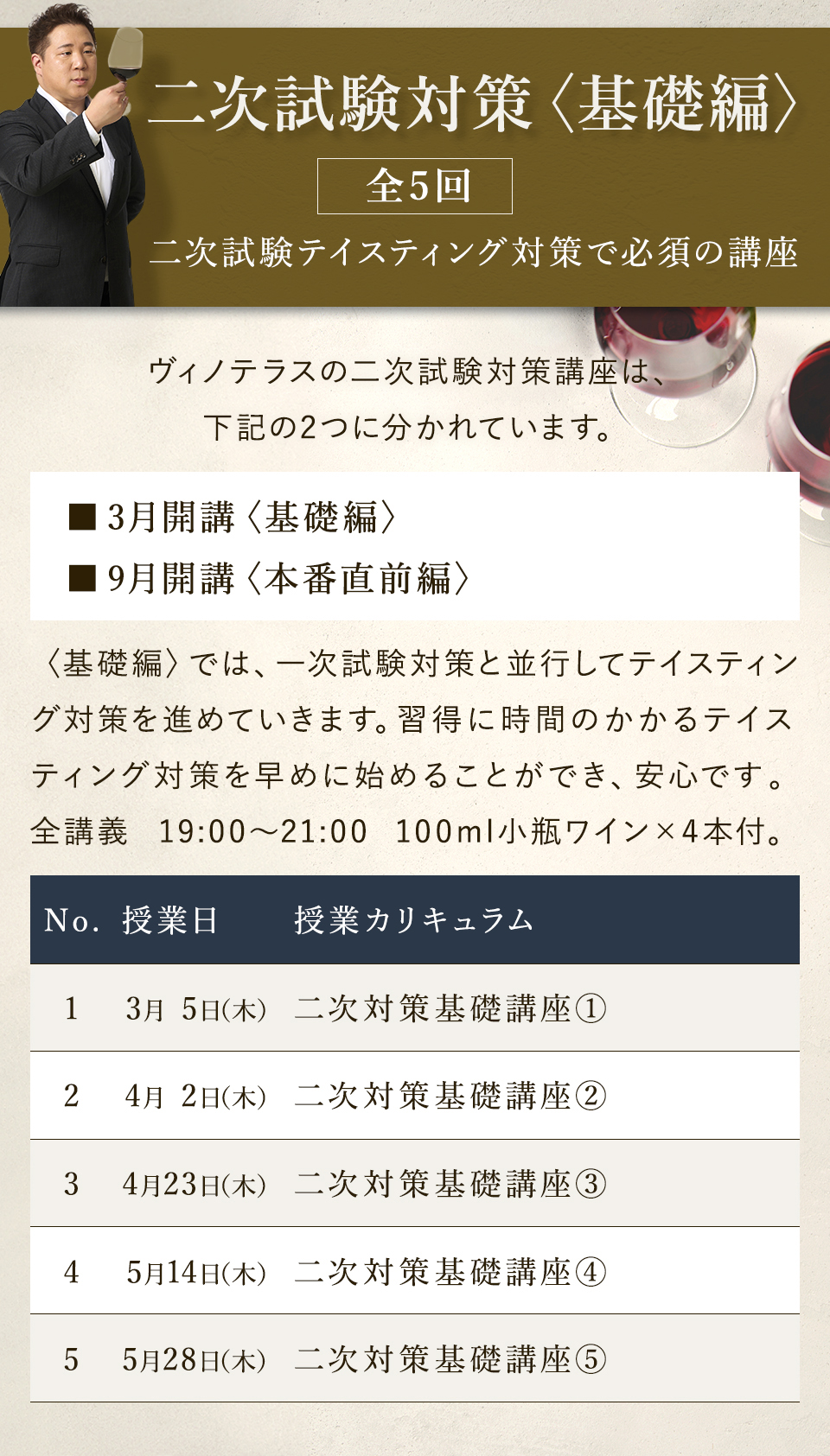 TOP ソムリエ・ワインエキスパート一次試験対策講座2026 表示切替: 写真のみ 説明付き 並び順: 標準 レビューの多い順 おすすめ商品順 新着商品順 値段の安い順 値段の高い順 名前:昇順 名前:降順 9件中1件~9件を表示 商品一覧 在庫切れ ソムリエ・ワインエキスパート試験対策無料体験講座 ¥0(税込) 【2026年度】【プレミアム】コンプリートコース(一次講座+二次講座(基礎編)+テキスト+VINOLET) ¥159,000(税込) 2026年度ソムリエ・ワインエキスパート試験対策講座 【2026年度】【プレミアム】一次試験対策講座(講座+テキスト+VINOLET) ¥125,000(税込) 2026年度ソムリエ・ワインエキスパート試験対策講座 【2026年度】【スタンダード】コンプリートコース(一次講座+二次講座(基礎編)+テキスト+VINOLET) 通常価格: ¥98,000(税込) 価格: ¥88,000(税込) 2026年度ソムリエ・ワインエキスパート試験対策講座 【2026年度】【スタンダード】一次試験対策講座(講座+テキスト+VINOLET) 通常価格: ¥59,000(税込) 価格: ¥49,000(税込) 2026年度ソムリエ・ワインエキスパート試験対策講座 【2026年度】【独学】コンプリートコース(テキスト+VINOLET+二次講座(基礎編)) ¥55,000(税込) 2026年度ソムリエ・ワインエキスパート試験対策講座 【2026年度】二次試験対策講座(基礎編) ¥44,000(税込) 2026年度ソムリエ・ワインエキスパート試験対策講座 【テキスト(2025年+2026年)】+【VINOLET】 ¥11,700(税込) 2026年度ソムリエ・ワインエキスパート試験対策講座 【2026年度】WEB問題集アプリ「VINOLET」トークン購入 ¥4,500(税込) 2026年度ソムリエ・ワインエキスパート試験対策講座 9件中1件~9件を表示