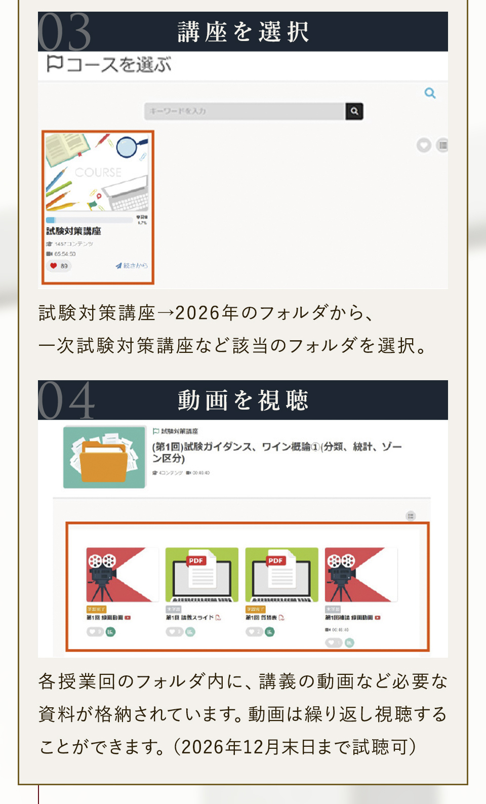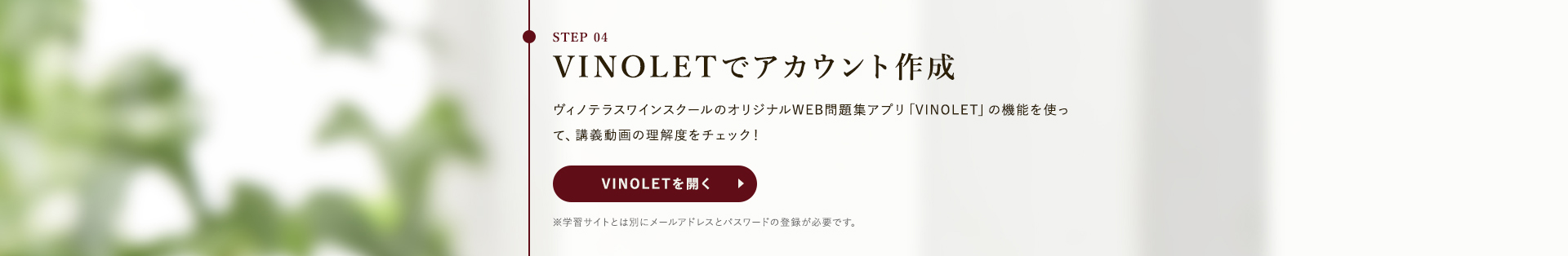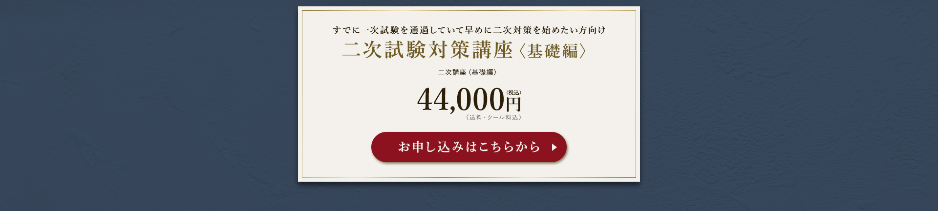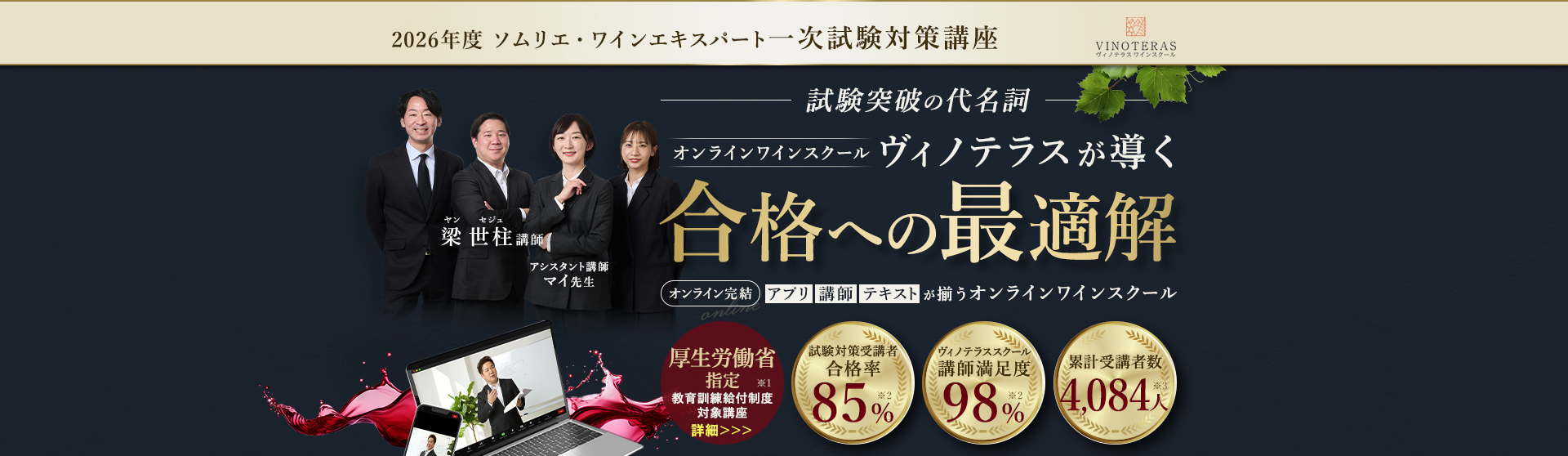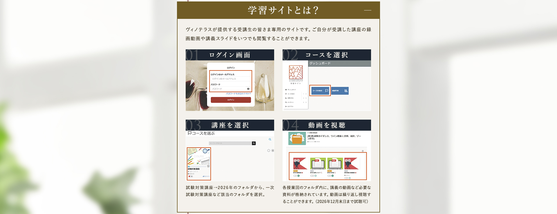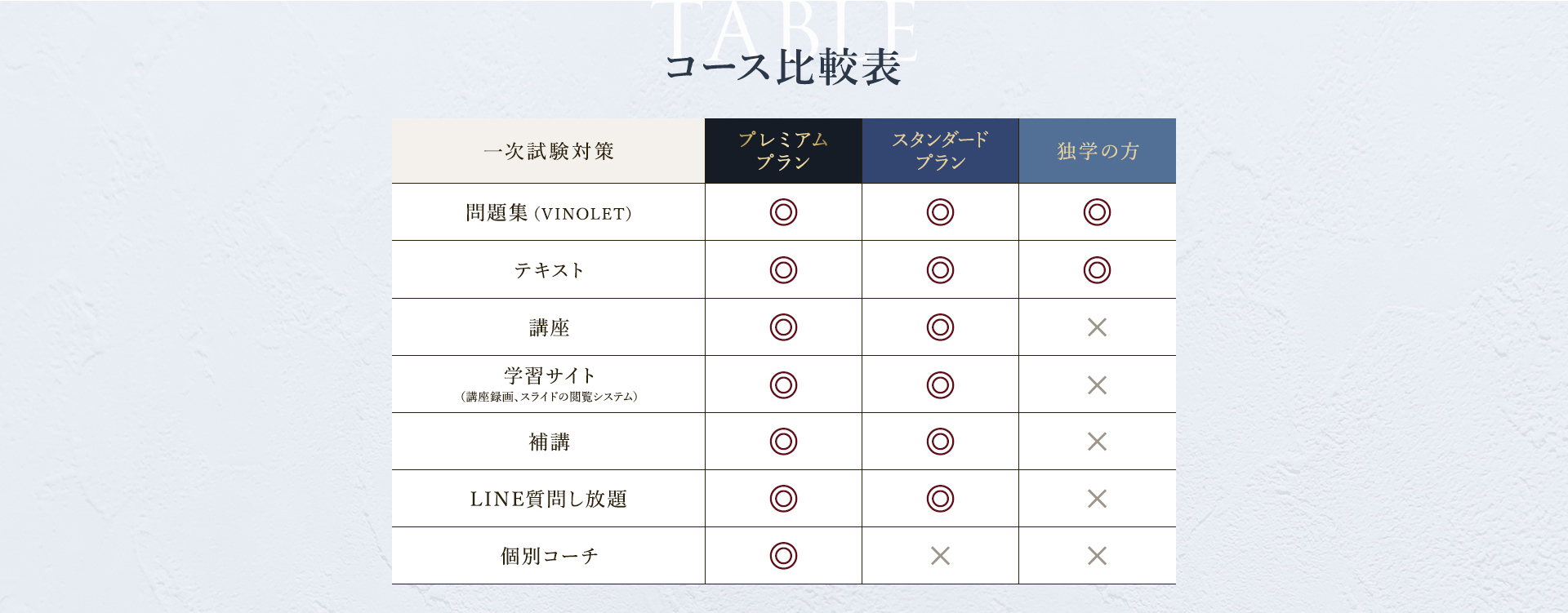 TOP ソムリエ・ワインエキスパート一次試験対策講座2026 表示切替: 写真のみ 説明付き 並び順: 標準 レビューの多い順 おすすめ商品順 新着商品順 値段の安い順 値段の高い順 名前:昇順 名前:降順 9件中1件~9件を表示 商品一覧 在庫切れ ソムリエ・ワインエキスパート試験対策無料体験講座 ¥0(税込) 【2026年度】【プレミアム】コンプリートコース(一次講座+二次講座(基礎編)+テキスト+VINOLET) ¥159,000(税込) 2026年度ソムリエ・ワインエキスパート試験対策講座 【2026年度】【プレミアム】一次試験対策講座(講座+テキスト+VINOLET) ¥125,000(税込) 2026年度ソムリエ・ワインエキスパート試験対策講座 【2026年度】【スタンダード】コンプリートコース(一次講座+二次講座(基礎編)+テキスト+VINOLET) 通常価格: ¥98,000(税込) 価格: ¥88,000(税込) 2026年度ソムリエ・ワインエキスパート試験対策講座 【2026年度】【スタンダード】一次試験対策講座(講座+テキスト+VINOLET) 通常価格: ¥59,000(税込) 価格: ¥49,000(税込) 2026年度ソムリエ・ワインエキスパート試験対策講座 【2026年度】【独学】コンプリートコース(テキスト+VINOLET+二次講座(基礎編)) ¥55,000(税込) 2026年度ソムリエ・ワインエキスパート試験対策講座 【2026年度】二次試験対策講座(基礎編) ¥44,000(税込) 2026年度ソムリエ・ワインエキスパート試験対策講座 【テキスト(2025年+2026年)】+【VINOLET】 ¥11,700(税込) 2026年度ソムリエ・ワインエキスパート試験対策講座 【2026年度】WEB問題集アプリ「VINOLET」トークン購入 ¥4,500(税込) 2026年度ソムリエ・ワインエキスパート試験対策講座 9件中1件~9件を表示