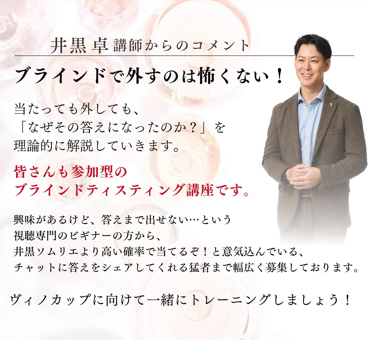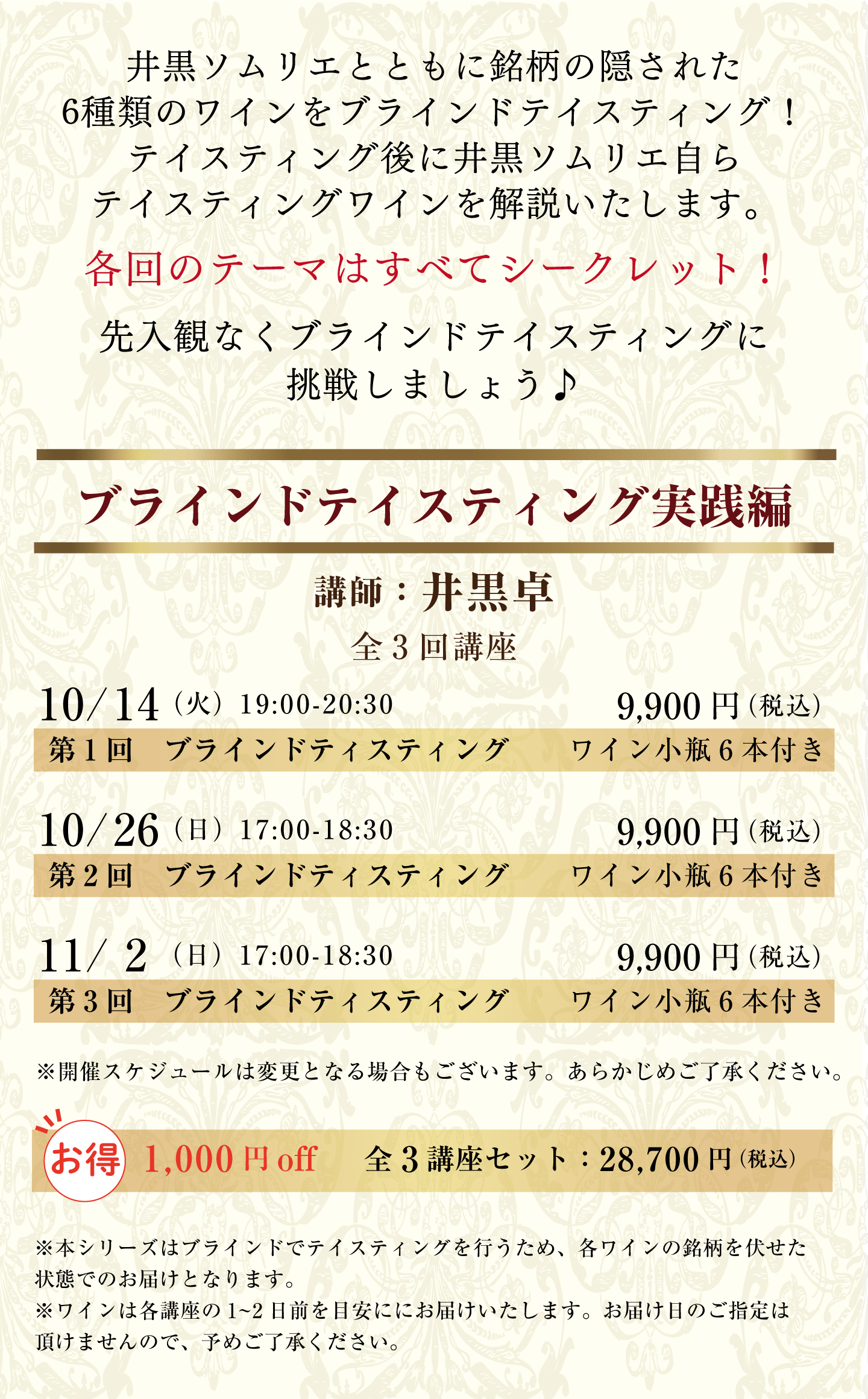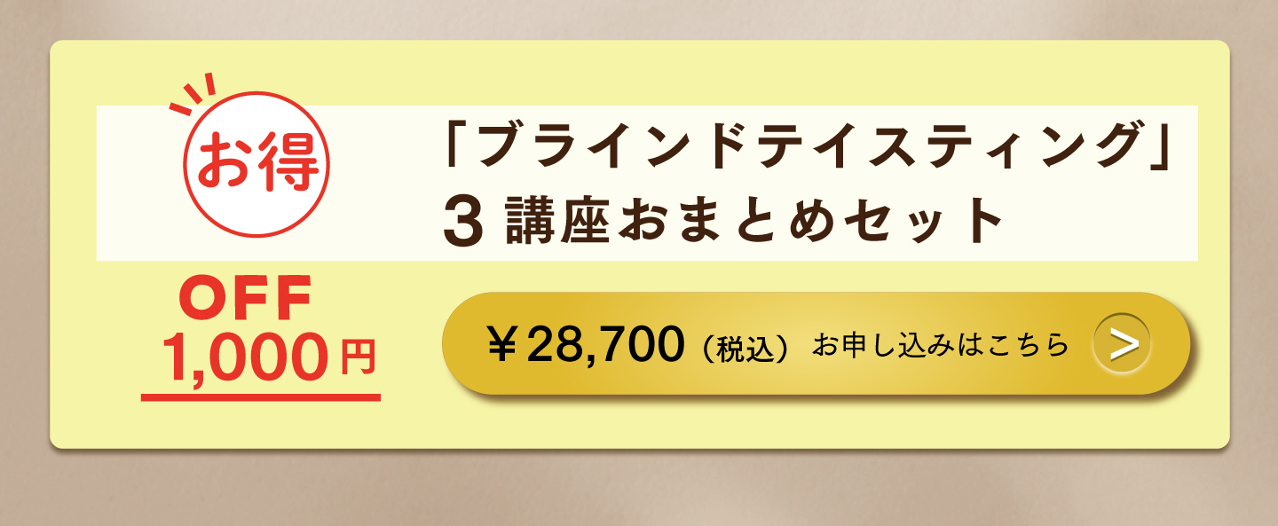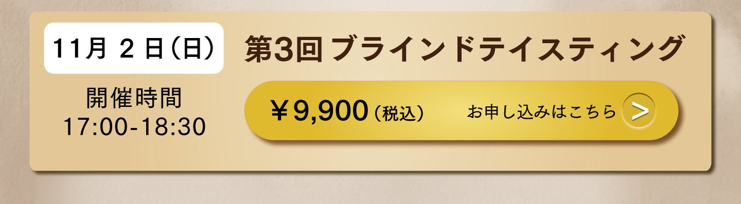 TOP ブラインドテイスティング実践編 お申し込みはこちらから 表示切替: 写真のみ 説明付き 並び順: 標準 レビューの多い順 おすすめ商品順 新着商品順 値段の安い順 値段の高い順 名前:昇順 名前:降順 4件中1件~4件を表示 商品一覧 在庫切れ ブラインドテイスティング実践編 3講座 おまとめセット ¥28,700(税込) 井黒ソムリエと一緒にブラインドに挑戦! ラベルを隠したワインと向き合うスリリングな体験。 見た目の情報に頼らず、香りと味わいだけでワインの正体に迫ります。 井黒ソムリエと一緒に、ライブ配信で楽しむ実践型ブラインド講座。 あなたの感覚と知識が、今、試される! 在庫切れ 【11月2日 (日)開催】ブラインドテイスティング実践編 第3回 ¥9,900(税込) 井黒ソムリエと一緒にブラインドに挑戦! ラベルを隠したワインと向き合うスリリングな体験。 見た目の情報に頼らず、香りと味わいだけでワインの正体に迫ります。 井黒ソムリエと一緒に、ライブ配信で楽しむ実践型ブラインド講座。 あなたの感覚と知識が、今、試される! 在庫切れ 【10月26日(日)開催】ブラインドテイスティング実践編 第2回 ¥9,900(税込) 井黒ソムリエと一緒にブラインドに挑戦! ラベルを隠したワインと向き合うスリリングな体験。 見た目の情報に頼らず、香りと味わいだけでワインの正体に迫ります。 井黒ソムリエと一緒に、ライブ配信で楽しむ実践型ブラインド講座。 あなたの感覚と知識が、今、試される! 在庫切れ 【10月14日(火)開催】ブラインドテイスティング実践編 第1回 ¥9,900(税込) 井黒ソムリエと一緒にブラインドに挑戦! ラベルを隠したワインと向き合うスリリングな体験。 見た目の情報に頼らず、香りと味わいだけでワインの正体に迫ります。 井黒ソムリエと一緒に、ライブ配信で楽しむ実践型ブラインド講座。 あなたの感覚と知識が、今、試される! 4件中1件~4件を表示