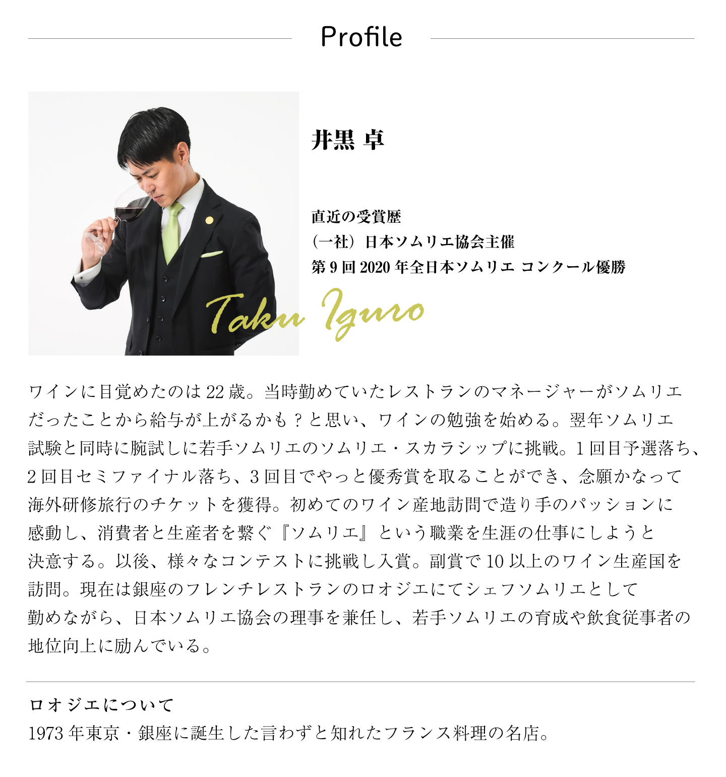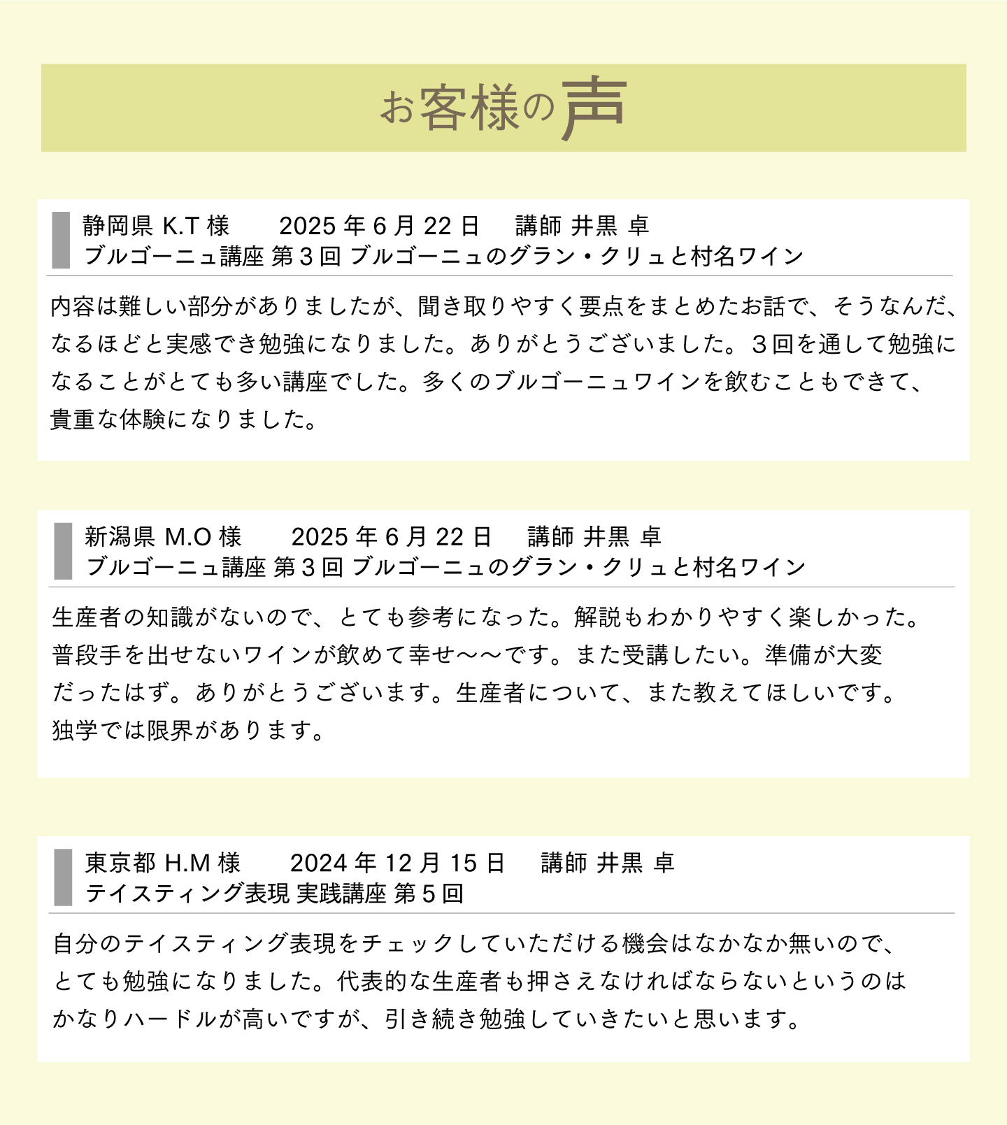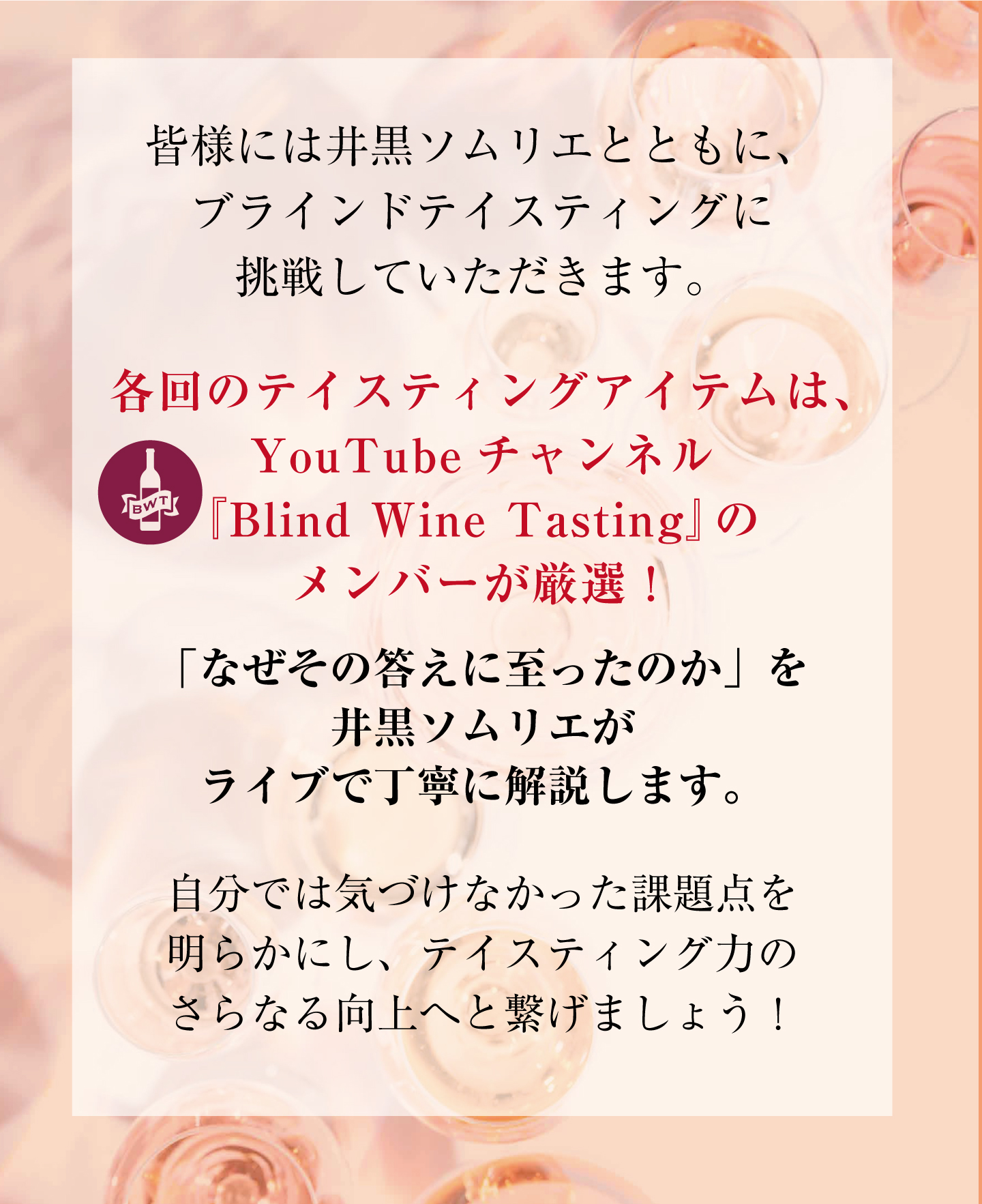 TOP ブラインドテイスティング実践編 お申し込みはこちらから 表示切替: 写真のみ 説明付き 並び順: 標準 レビューの多い順 おすすめ商品順 新着商品順 値段の安い順 値段の高い順 名前:昇順 名前:降順 4件中1件~4件を表示 商品一覧 在庫切れ ブラインドテイスティング実践編 3講座 おまとめセット ¥28,700(税込) 井黒ソムリエと一緒にブラインドに挑戦! ラベルを隠したワインと向き合うスリリングな体験。 見た目の情報に頼らず、香りと味わいだけでワインの正体に迫ります。 井黒ソムリエと一緒に、ライブ配信で楽しむ実践型ブラインド講座。 あなたの感覚と知識が、今、試される! 在庫切れ 【11月2日 (日)開催】ブラインドテイスティング実践編 第3回 ¥9,900(税込) 井黒ソムリエと一緒にブラインドに挑戦! ラベルを隠したワインと向き合うスリリングな体験。 見た目の情報に頼らず、香りと味わいだけでワインの正体に迫ります。 井黒ソムリエと一緒に、ライブ配信で楽しむ実践型ブラインド講座。 あなたの感覚と知識が、今、試される! 在庫切れ 【10月26日(日)開催】ブラインドテイスティング実践編 第2回 ¥9,900(税込) 井黒ソムリエと一緒にブラインドに挑戦! ラベルを隠したワインと向き合うスリリングな体験。 見た目の情報に頼らず、香りと味わいだけでワインの正体に迫ります。 井黒ソムリエと一緒に、ライブ配信で楽しむ実践型ブラインド講座。 あなたの感覚と知識が、今、試される! 在庫切れ 【10月14日(火)開催】ブラインドテイスティング実践編 第1回 ¥9,900(税込) 井黒ソムリエと一緒にブラインドに挑戦! ラベルを隠したワインと向き合うスリリングな体験。 見た目の情報に頼らず、香りと味わいだけでワインの正体に迫ります。 井黒ソムリエと一緒に、ライブ配信で楽しむ実践型ブラインド講座。 あなたの感覚と知識が、今、試される! 4件中1件~4件を表示