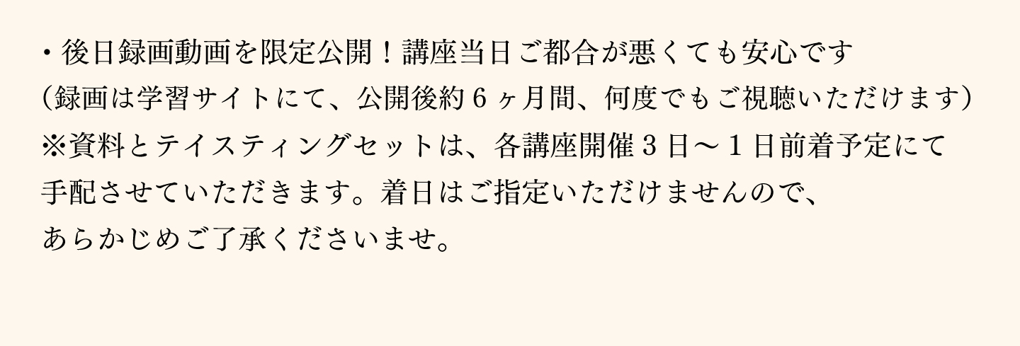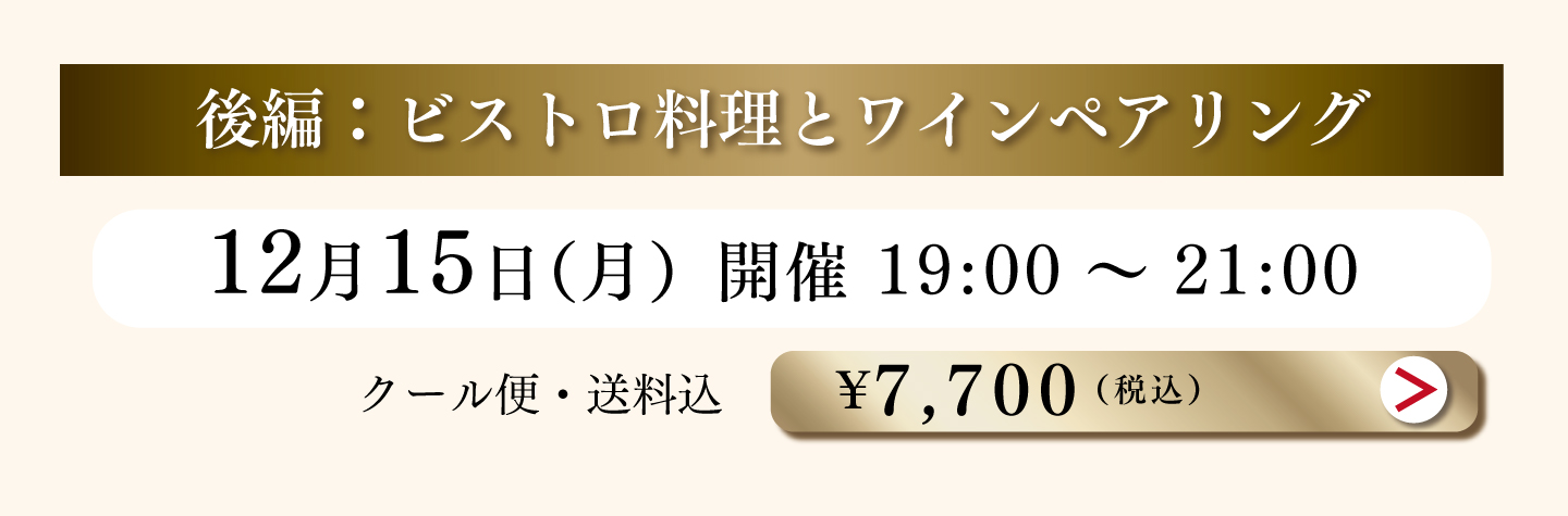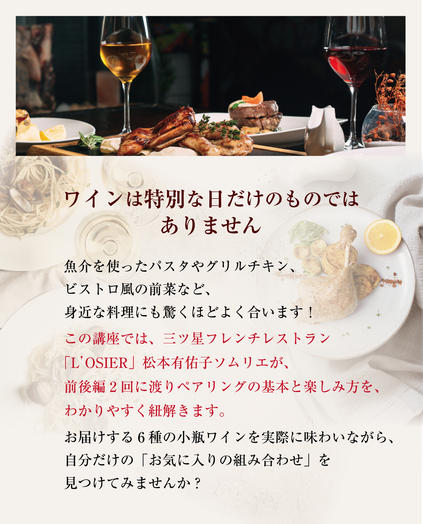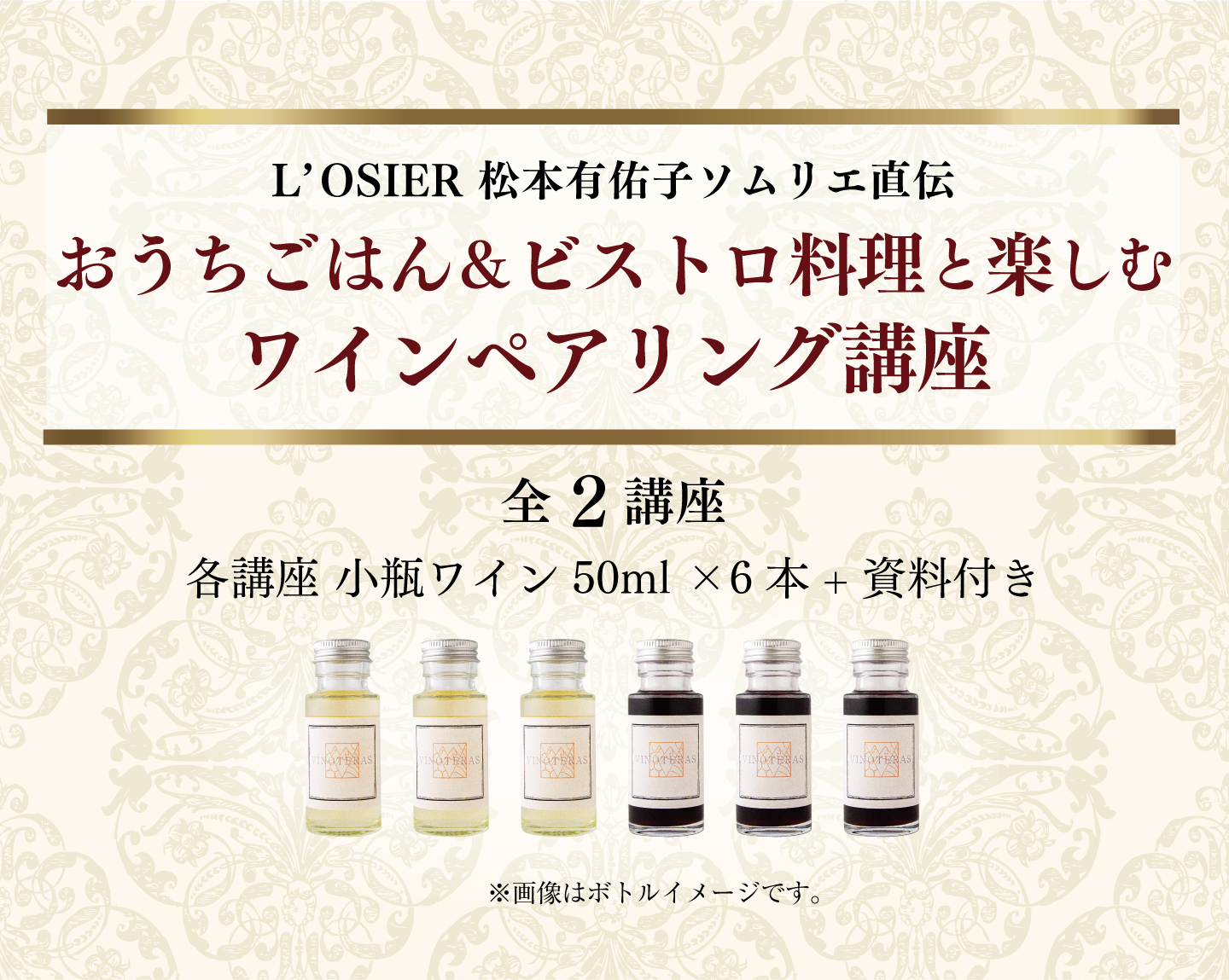 TOP おうちごはん&ビストロ料理と楽しむ ワインペアリング講座 表示切替: 写真のみ 説明付き 並び順: 標準 レビューの多い順 おすすめ商品順 新着商品順 値段の安い順 値段の高い順 名前:昇順 名前:降順 3件中1件~3件を表示 商品一覧 在庫切れ 【11月3日(月)開催】おうちごはん&ビストロ料理と楽しむ ワインペアリング講座 前編 ¥7,700(税込) いつもの料理にワインを合わせてみよう!おうちごはんからビストロ料理まで、各回6種類のワインと共にペアリングのコツを気軽に学べる!初心者からワイン好きまで、日常の食卓や外食がもっとおいしく楽しくなるヒントをお届けします! 在庫切れ 【12月15日(月)開催】おうちごはん&ビストロ料理と楽しむ ワインペアリング講座 後編 ¥7,700(税込) いつもの料理にワインを合わせてみよう!おうちごはんからビストロ料理まで、各回6種類のワインと共にペアリングのコツを気軽に学べる!初心者からワイン好きまで、日常の食卓や外食がもっとおいしく楽しくなるヒントをお届けします! 在庫切れ おうちごはん&ビストロ料理と楽しむ ワインペアリング講座 前後編 2講座セット ¥14,400(税込) いつもの料理にワインを合わせてみよう!おうちごはんからビストロ料理まで、各回6種類のワインと共にペアリングのコツを気軽に学べる!初心者からワイン好きまで、日常の食卓や外食がもっとおいしく楽しくなるヒントをお届けします! 3件中1件~3件を表示