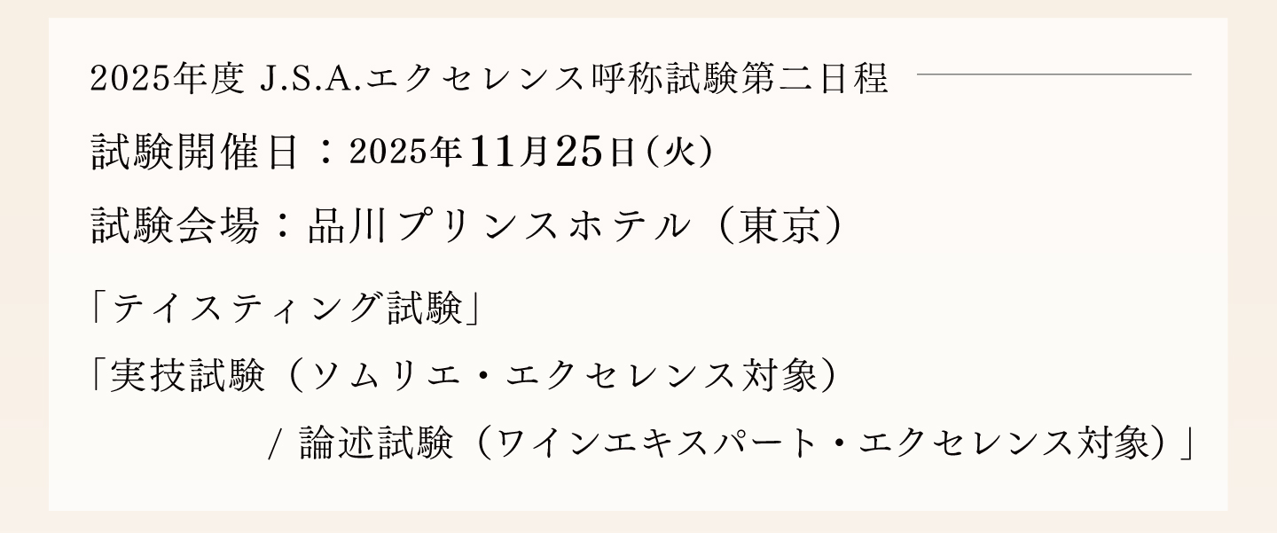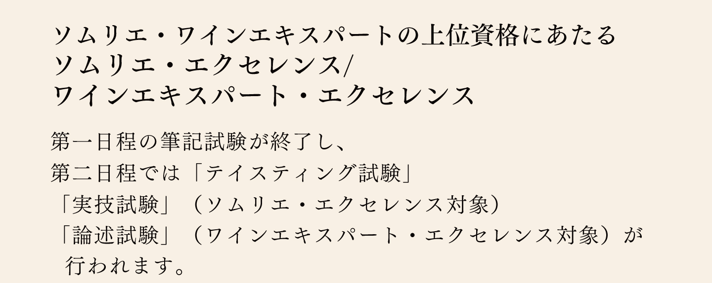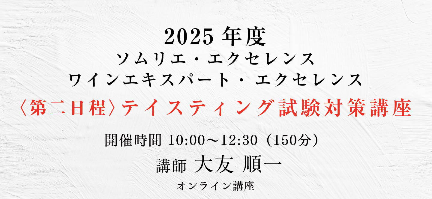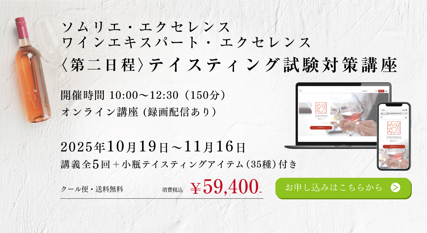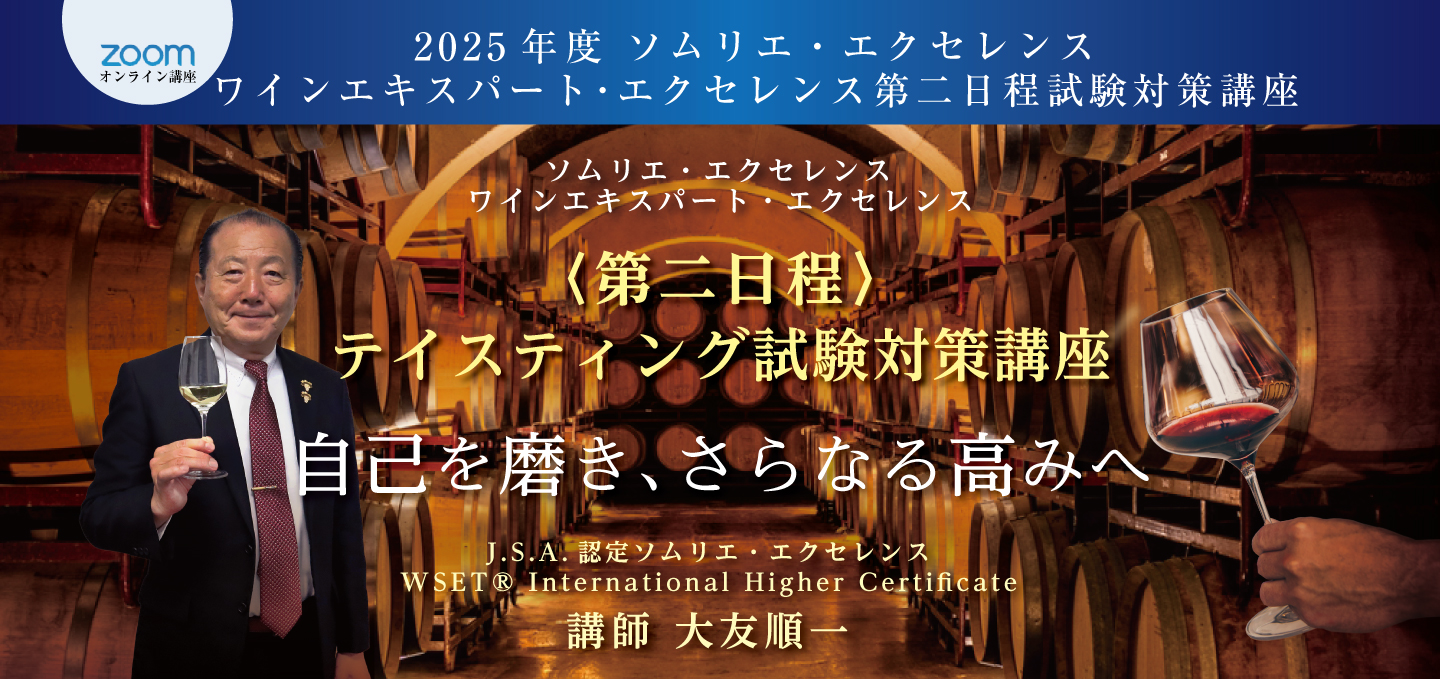 TOP エクセレンス第二日程講座 表示切替: 写真のみ 説明付き 並び順: 標準 レビューの多い順 おすすめ商品順 新着商品順 値段の安い順 値段の高い順 名前:昇順 名前:降順 3件中1件~3件を表示 商品一覧 在庫切れ 2025年度 ソムリエ・エクセレンス/ワインエキスパート・ エクセレンス〈第二日程〉テイスティング試験対策講座 ¥59,400(税込) 本講座では第一日程を通過され、第二日程に挑む皆様へ向けたテイスティング試験対策を行います。エクセレンスのテイスティングの試験は、ブラインドコンテストの品種当てや、ソムリエコンクールのテイスティングコメントとは全く異なる、ワイン専門家としての「分析的コメント」が求められます。独学で対策をするのは決して容易ではないエクセレンス試験だからこそ、ベテラン講師の合格メソッドをもとに知識に磨きをかけ、合格を目指してまいりましょう! 2025年度 ソムリエ・エクセレンス 実技試験対策講座 ¥7,700(税込) ソムリエ・エクセレンスの試験の中で最も合格率の低いのが「サービス・口頭試問」です。昨年の合格率は、ストレート受験者で27%、再受験者も含めて34%でした。この試験用にしっかり準備しなければ合格できません。昨年のストレート合格者5名の内、大友受講生が4名を占めました。また再受験者も含めて13名の内、大友受講生が8名を占めました。しっかり準備すれば、合格は可能です! 2025年度 ワインエキスパート・エクセレンス 論述試験対策講座 ¥7,700(税込) エクセレンスの論述試験は、ワイン愛好家が「あなたと一緒にワインを楽しみたいか」というワインエキスパート・エクセレンスの資質を問う試験です。過去問題からの傾向をみた上で、予想問題から自分の回答を作成して、キーワードを暗記しておくことが合格のポイントです。 また、解答作成上でも合否を分けるポイントがありますので、それも伝授していきます。 3件中1件~3件を表示