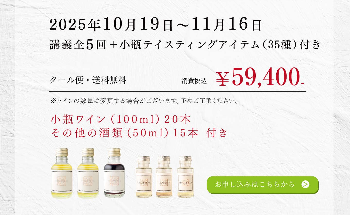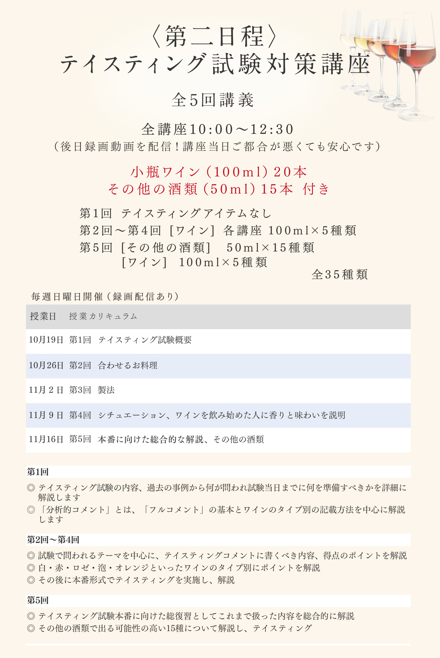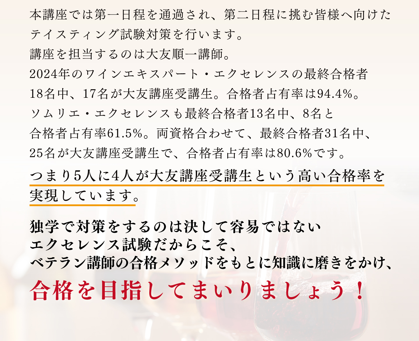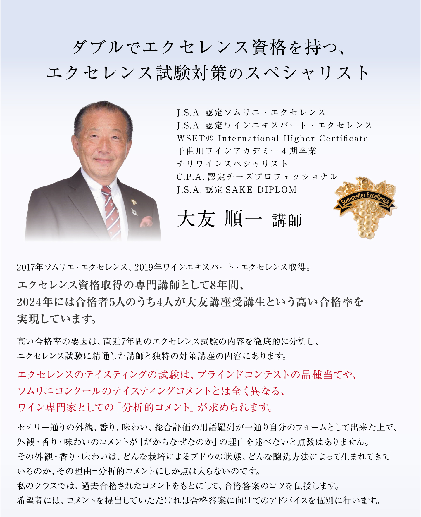 TOP エクセレンス第二日程講座 表示切替: 写真のみ 説明付き 並び順: 標準 レビューの多い順 おすすめ商品順 新着商品順 値段の安い順 値段の高い順 名前:昇順 名前:降順 3件中1件~3件を表示 商品一覧 在庫切れ 2025年度 ソムリエ・エクセレンス/ワインエキスパート・ エクセレンス〈第二日程〉テイスティング試験対策講座 ¥59,400(税込) 本講座では第一日程を通過され、第二日程に挑む皆様へ向けたテイスティング試験対策を行います。エクセレンスのテイスティングの試験は、ブラインドコンテストの品種当てや、ソムリエコンクールのテイスティングコメントとは全く異なる、ワイン専門家としての「分析的コメント」が求められます。独学で対策をするのは決して容易ではないエクセレンス試験だからこそ、ベテラン講師の合格メソッドをもとに知識に磨きをかけ、合格を目指してまいりましょう! 2025年度 ソムリエ・エクセレンス 実技試験対策講座 ¥7,700(税込) ソムリエ・エクセレンスの試験の中で最も合格率の低いのが「サービス・口頭試問」です。昨年の合格率は、ストレート受験者で27%、再受験者も含めて34%でした。この試験用にしっかり準備しなければ合格できません。昨年のストレート合格者5名の内、大友受講生が4名を占めました。また再受験者も含めて13名の内、大友受講生が8名を占めました。しっかり準備すれば、合格は可能です! 2025年度 ワインエキスパート・エクセレンス 論述試験対策講座 ¥7,700(税込) エクセレンスの論述試験は、ワイン愛好家が「あなたと一緒にワインを楽しみたいか」というワインエキスパート・エクセレンスの資質を問う試験です。過去問題からの傾向をみた上で、予想問題から自分の回答を作成して、キーワードを暗記しておくことが合格のポイントです。 また、解答作成上でも合否を分けるポイントがありますので、それも伝授していきます。 3件中1件~3件を表示