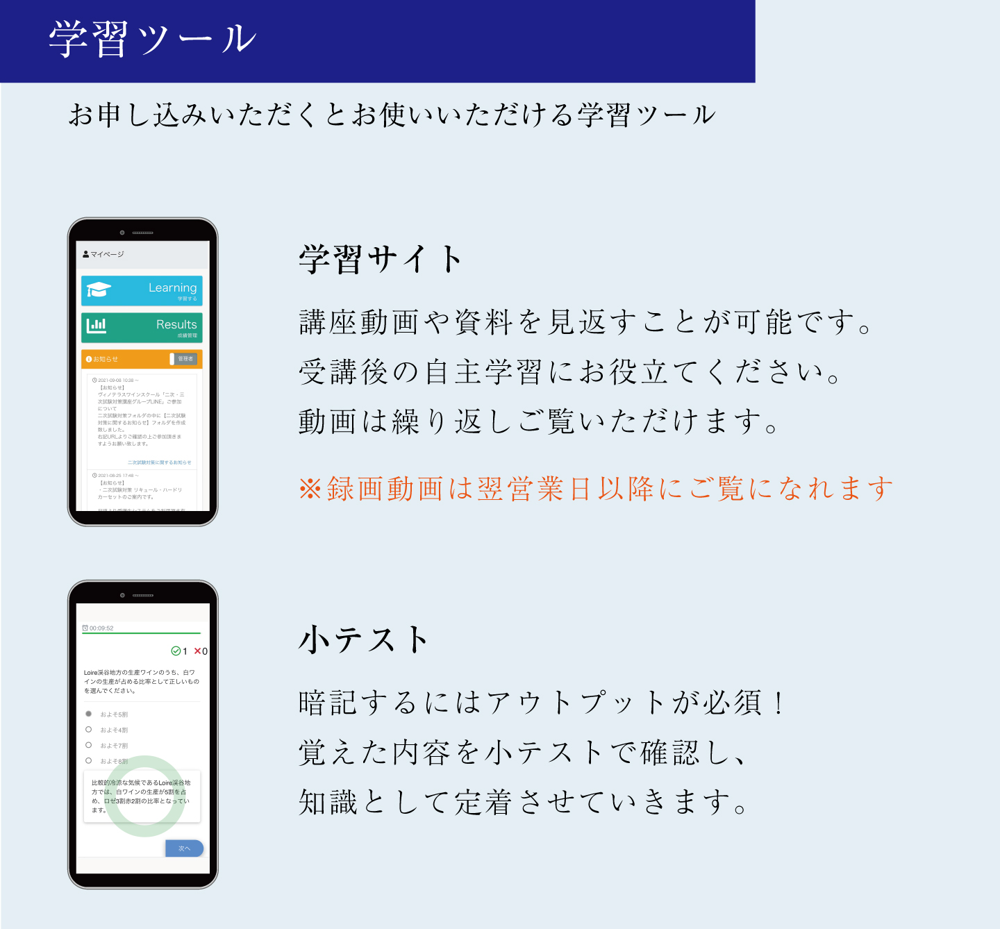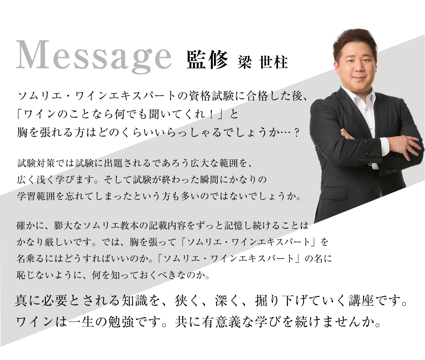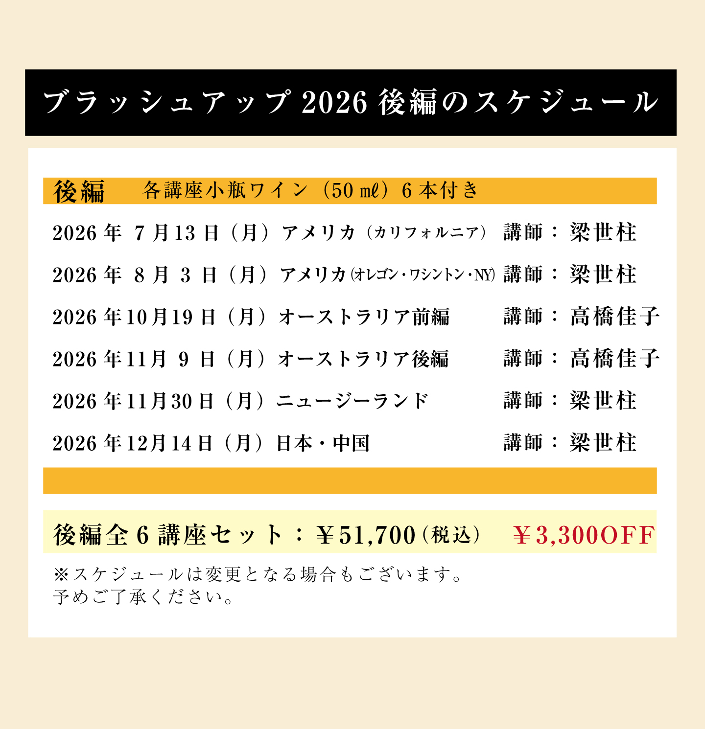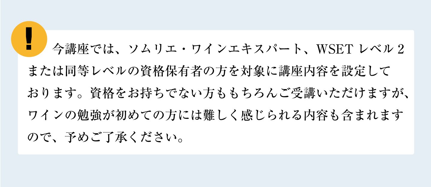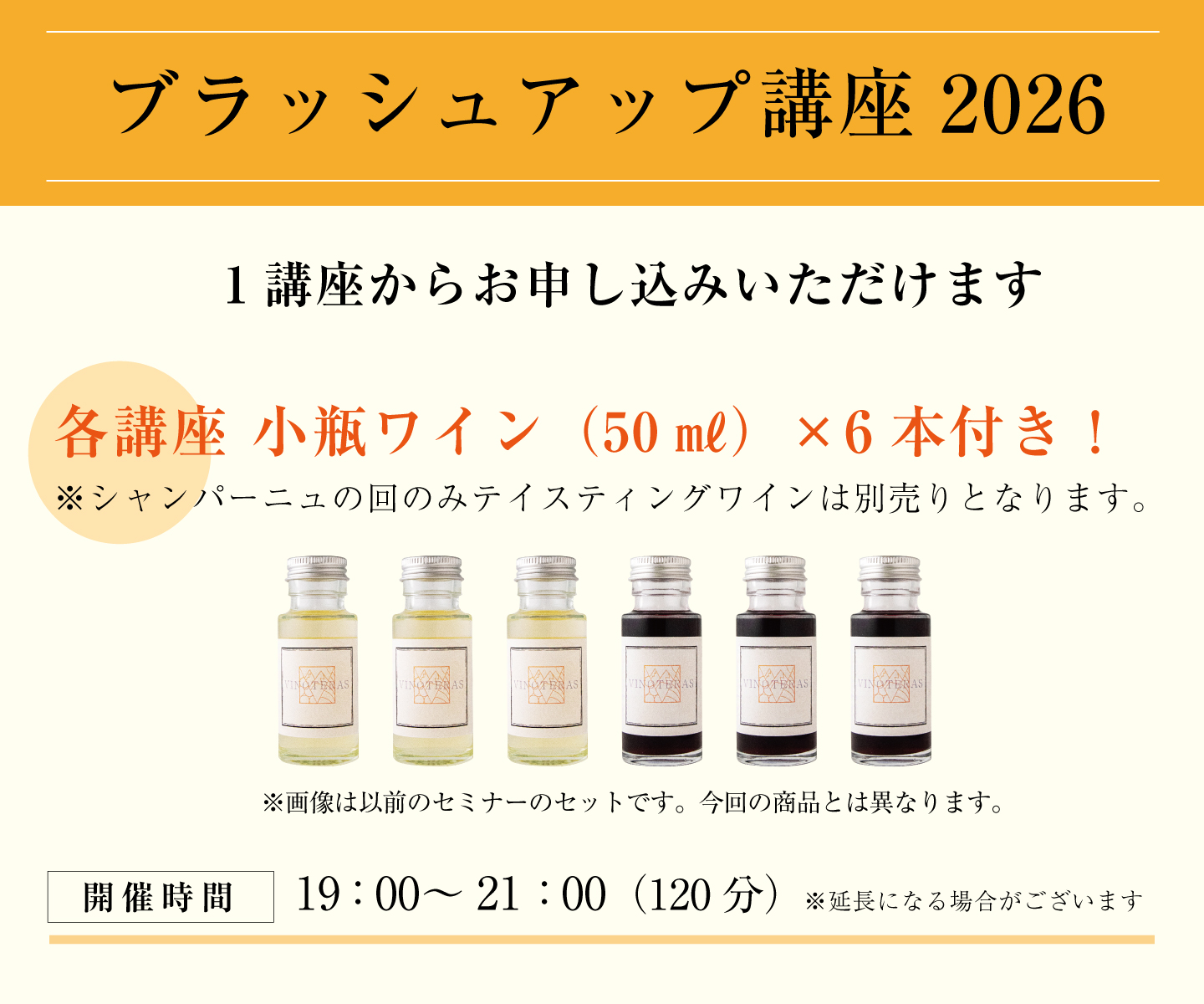 TOP ブラッシュアップ講座2026 表示切替: 写真のみ 説明付き 並び順: 標準 レビューの多い順 おすすめ商品順 新着商品順 値段の安い順 値段の高い順 名前:昇順 名前:降順 7件中1件~7件を表示 商品一覧 在庫切れ ブラッシュアップ講座 2026 前編 全6講座セット ¥45,400(税込) 学んだ膨大な「情報」を活かせる「知識」に! 豪華講師陣が、自らの専門分野をとことん解説いたします。 ソムリエ・ワインエキスパート試験には合格したけど、これからどうしよう、、 すでに覚えた内容、結構忘れてしまったな、、 次はエクセレンスって思ってるけど、何から始めたらいいのだろう? 試験のために覚えたこと、一時の暗記ではなく、知識として定着させませんか? 在庫切れ 【1/19(月)開催】 ブラッシュアップ講座 2026 ワインメイキング ¥8,800(税込) なぜバトナージュをするのか、なぜ特定のタイミングで亜硫酸を添加するのか、なぜ新樽を使うのか。それらの工程が意味すること、それぞれのメリット、デメリットを知れば、ワインをより深く理解することへと必ず繋がります。 在庫 41セット 【2/2(月)開催】 ブラッシュアップ講座 2026 ボルドー ¥9,900(税込) ボルドーを理解するために本当に大切な知識、ボルドーを美味しく楽しむために知っておくべきこと、ボルドーのポテンシャルを最大限に発揮させるための技術があります。この講座を通じて、皆様が真のボルドー上手になれることを願っております。 在庫 49セット 【3/16(月)開催】 ブラッシュアップ講座 2026 ロワール・アルザス・ジュラ・サヴォワ ¥8,800(税込) アルザスは非常にシンプルな構成の原産地呼称制度によってコントロールされていますが、多すぎるグランクリュ、温暖化、様々な例外が奥深さをもたらしています。一方でロワールは、多種多様な品種が細かいAOCによって厳密に規定された世界的にも非常に特殊な産地です。また、ジュラとサヴォアは一括りにされがちな産地ですが、地品種もテロワールも異なり、それぞれが非常に特徴あるワイン造りを行っています。 在庫 48セット 【4/20(月)開催】 ブラッシュアップ講座 2026 シャンパーニュ ¥2,500(税込) シャンパーニュほど、あらゆる意味でブランドイメージが先行する産地はありません。 そして、ブランドイメージに縛られたままでは、驚くほどの多様性に満ちたシャンパーニュのごく一部しか楽しめません。ブランドの味とテロワールの味の違いや、シャンパーニュを構成する複雑な要素を丁寧に深く知ることで、NM、RMに関わらず、よりスマートなシャンパーニュ選びができるようになります。 在庫 48セット 【5/18(月)開催】 ブラッシュアップ講座 2026 ブルゴーニュ ¥9,900(税込) 経験を積んだソムリエでも、一筋縄ではいかないのがブルゴーニュの難しさでもあります。 裏切られるのもブルゴーニュの魅力のうち、とすら言われるほどです。 皆様の「ブルゴーニュ成功率」を上げるために、お役立てできるはずです。また、爆発的な高騰が続くブルゴーニュですが、まだこの偉大な産地を諦めるには早すぎます。 在庫 49セット 【6/15(月)開催】 ブラッシュアップ講座 2026 南フランス全域 ¥8,800(税込) あまり親しみのないワイン、膨大な数のAOC、複雑な品種やスタイルの構成。 試験対策の段階ではただ無心に覚えるだけの対象になり、試験終了後も興味を向けられることが少ないのが南フランスです。しかし、銘醸ワインが数多くあり、ローヌ地方の特殊な例を除けば、極めてコストパフォーマンスにも優れたワインが多いため、その個性やスタイルをしっかりと把握すれば、日常におけるフレンチワインのヴァリエーションが格段に広がるのは間違いありません。 7件中1件~7件を表示