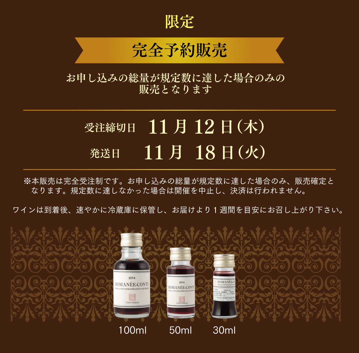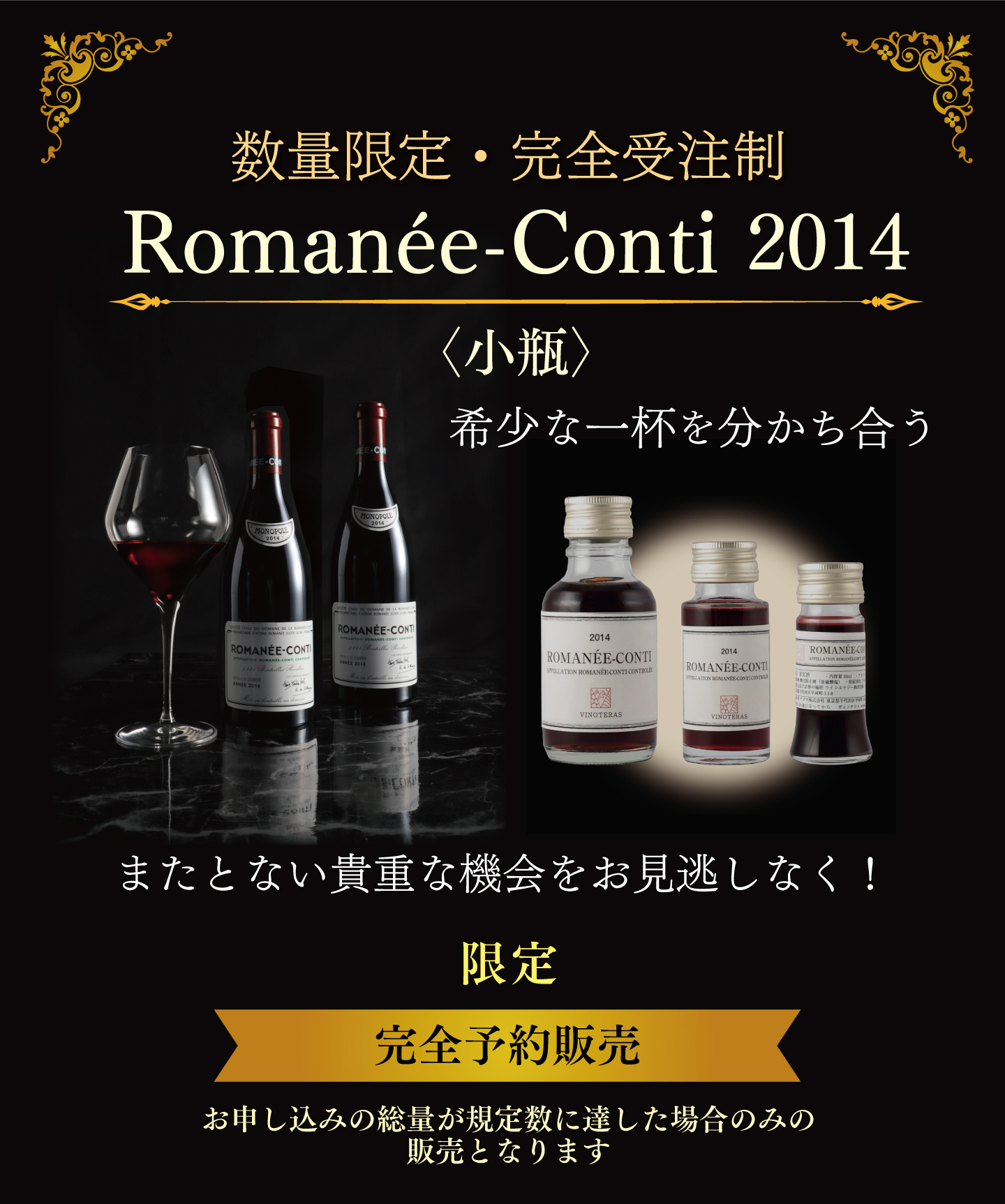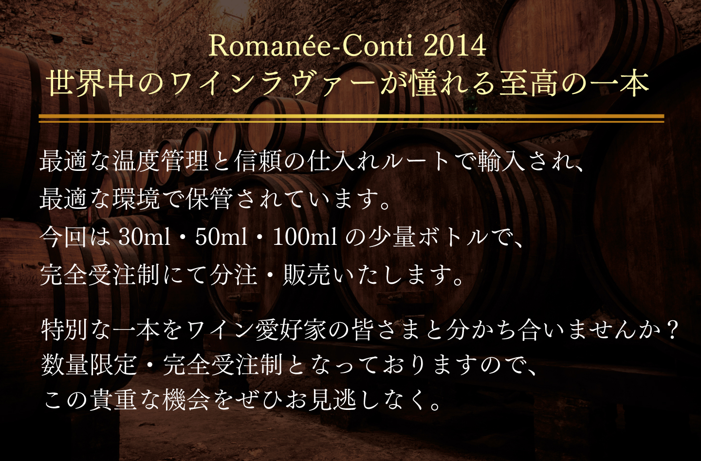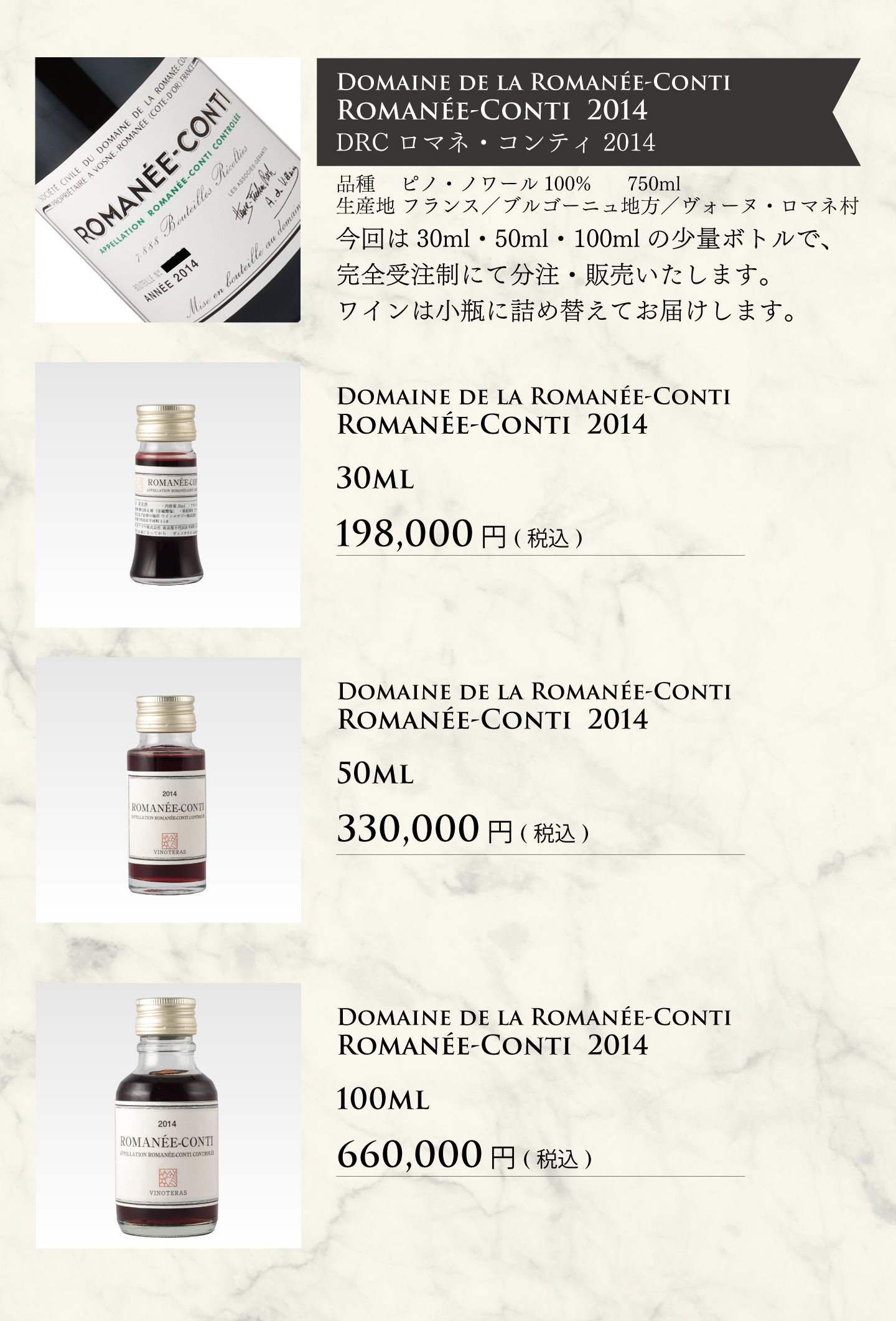 TOP ワインセット一覧 Romanee-Conti 2014〈小瓶〉完全受注販売 価格: ¥198,000 (税込) ~ ¥660,000 (税込) 販売期間: ボトル容量価格在庫購入Romanee-Conti 30ml¥198,000(税込)在庫切れ Romanee-Conti 50ml¥330,000(税込)在庫切れ Romanee-Conti 100ml¥660,000(税込)在庫切れ 返品についての詳細はこちら 数量: セット ボトル容量価格在庫購入Romanee-Conti 30ml¥198,000(税込)在庫切れ Romanee-Conti 50ml¥330,000(税込)在庫切れ Romanee-Conti 100ml¥660,000(税込)在庫切れ Romanee-Conti 2014〈小瓶〉完全受注販売