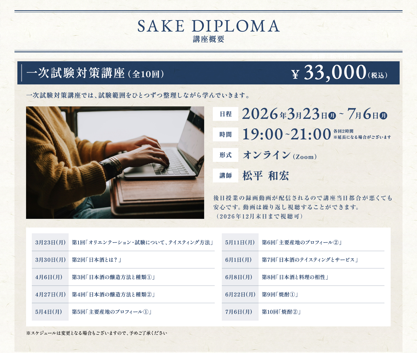 TOP SAKE DIPLOMA一次試験対策講座 2026年度SAKE DIPLOMA 一次試験対策講座 価格: ¥33,000 (税込) [ポイント還元 1,650ポイント~] 販売期間: 数量: セット 在庫: 在庫あり 在庫 在庫あり 返品についての詳細はこちら 2026年度SAKE DIPLOMA 一次試験対策講座