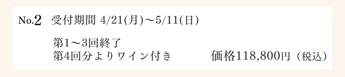 TOP エクセレンス途中参加 【4/21~5/11受付】エクセレンス途中参加 第4回~15回分ワイン付き 価格: ¥118,800 (税込) 販売期間: 2025年04月21日00時00分~2025年05月11日23時59分 数量: セット 在庫: 在庫切れ 在庫 在庫切れ 返品についての詳細はこちら 【4/21~5/11受付】エクセレンス途中参加 第4回~15回分ワイン付き