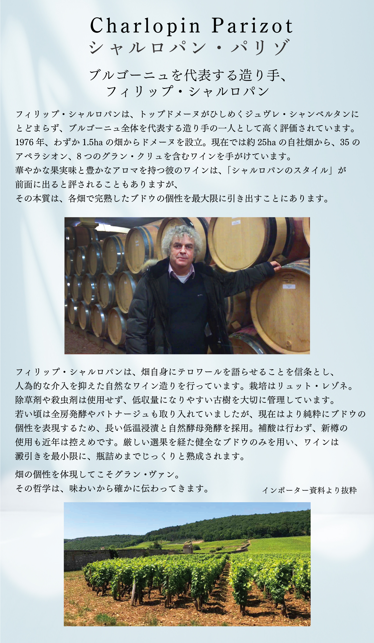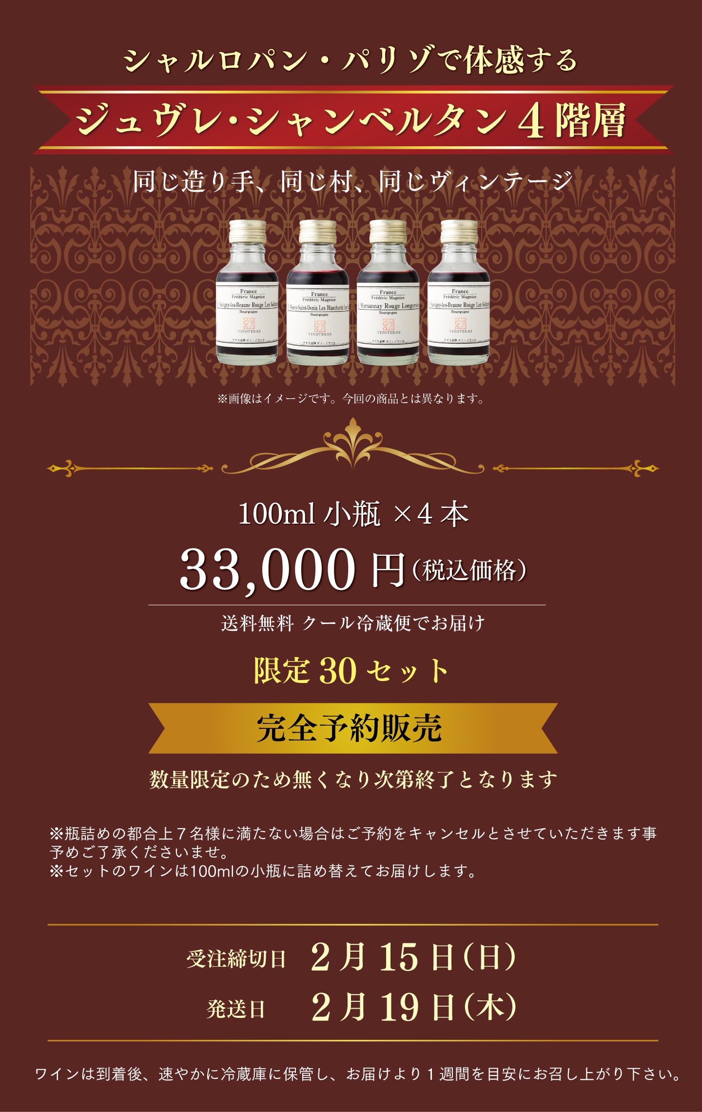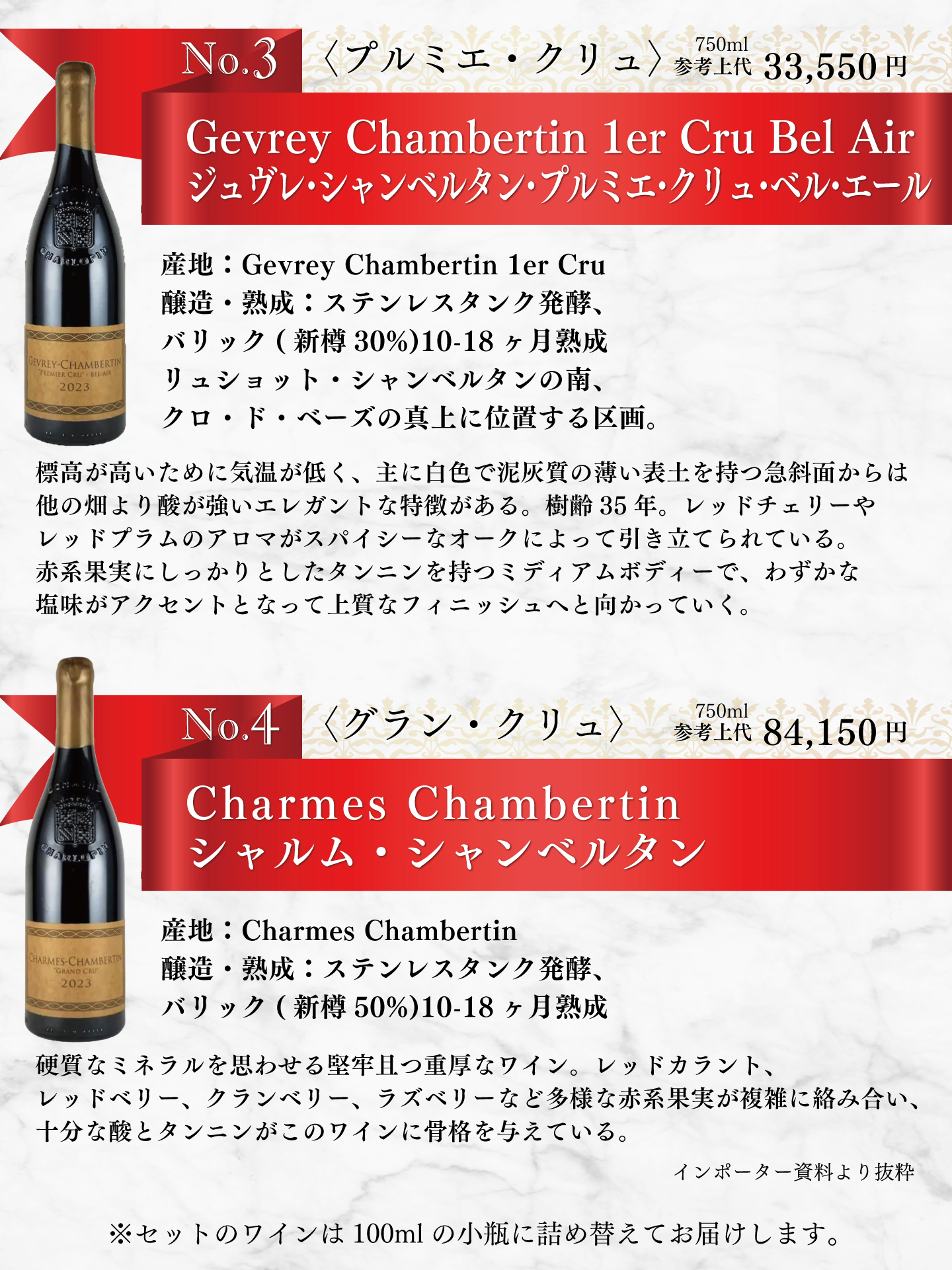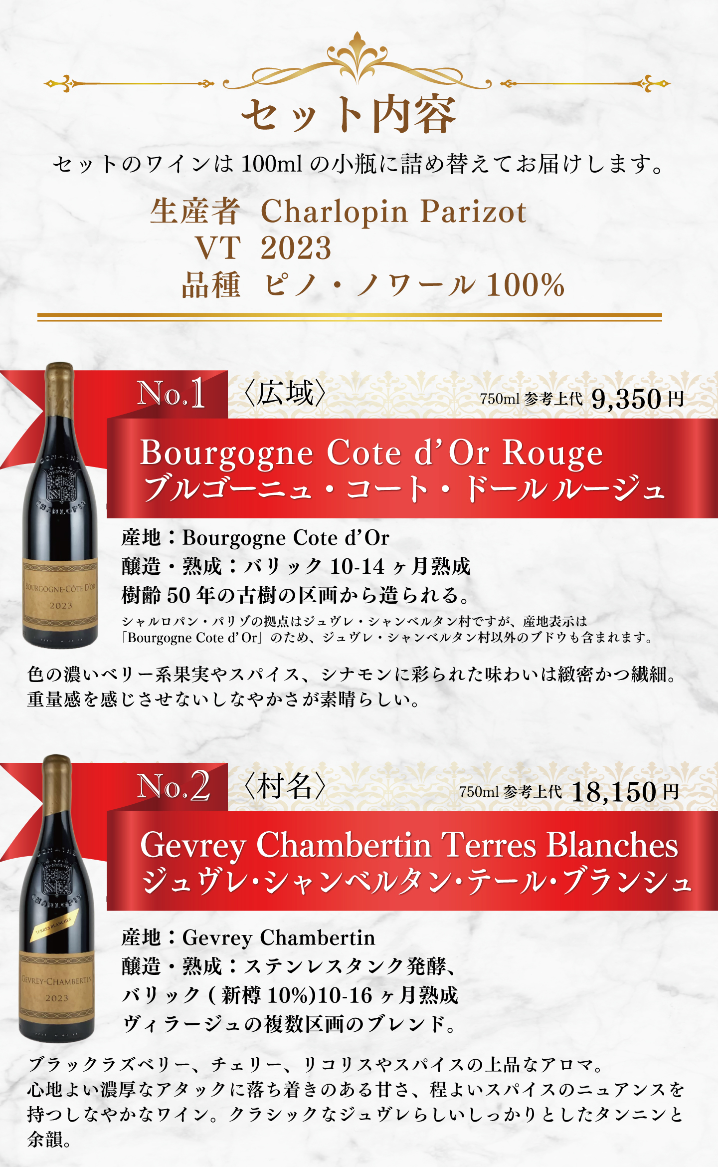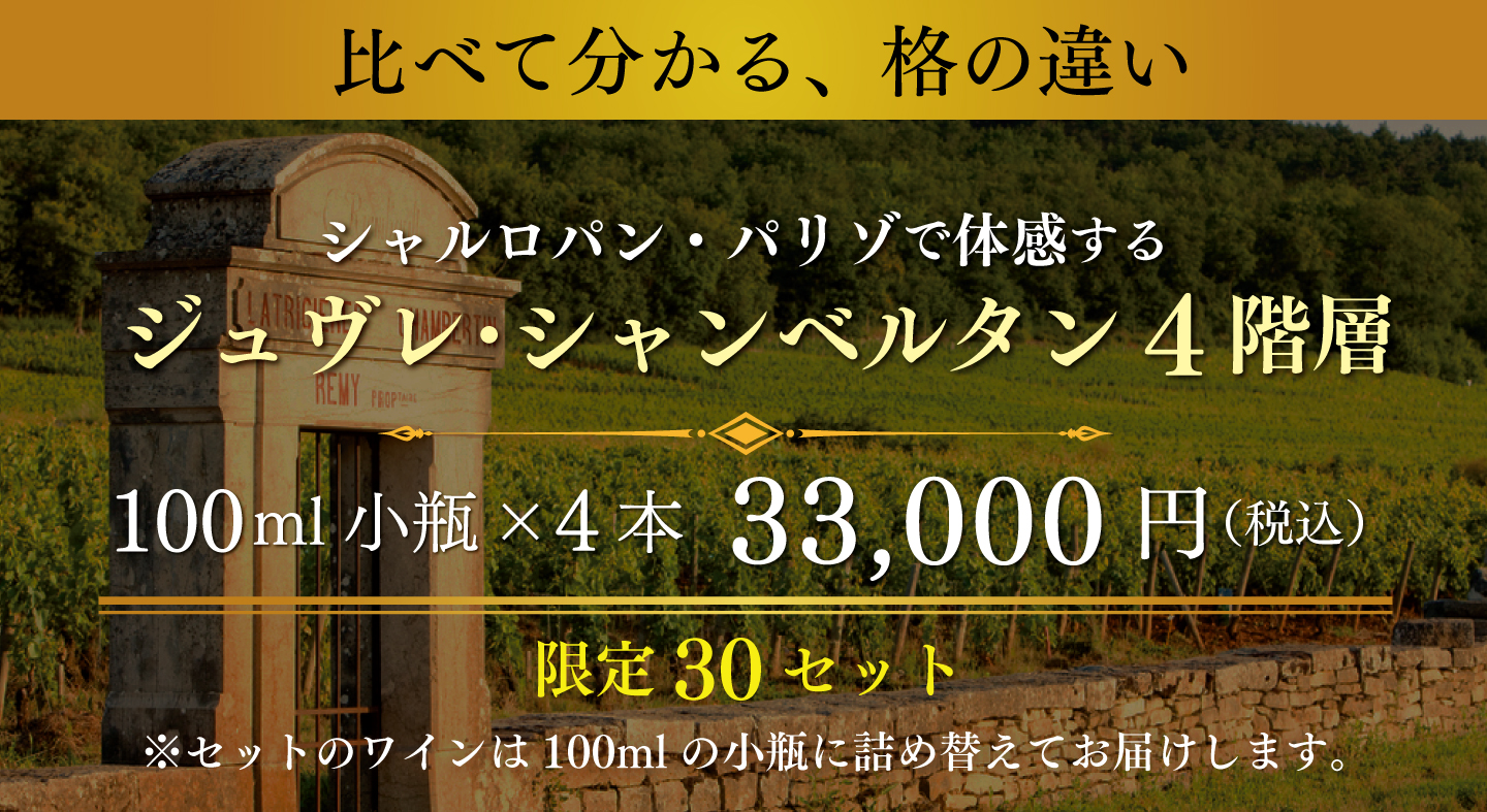 TOP ワインセット一覧 シャルロパン・パリゾで体感するジュヴレ・シャンベルタン4階層 小瓶4本セット 価格: ¥33,000 (税込) [ポイント還元 1,650ポイント~] 販売期間: 数量: セット 在庫: 4セット 在庫 4セット 返品についての詳細はこちら シャルロパン・パリゾで体感するジュヴレ・シャンベルタン4階層 小瓶4本セット お申し込みはこちらから