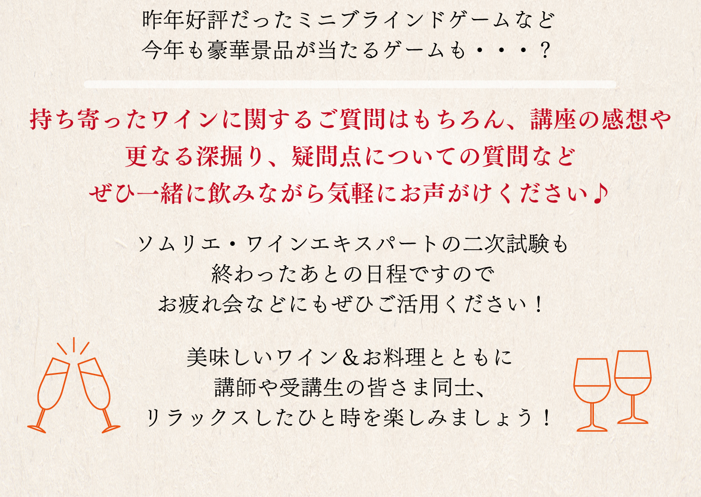 ソムリエ・ワインエキスパートの二次試験も終わったあとの日程ですのでお疲れ会などにもぜひご活用ください!美味しいワイン&お料理とともに講師や受講生の皆さま同士、リラックスしたひと時を楽しみましょう!