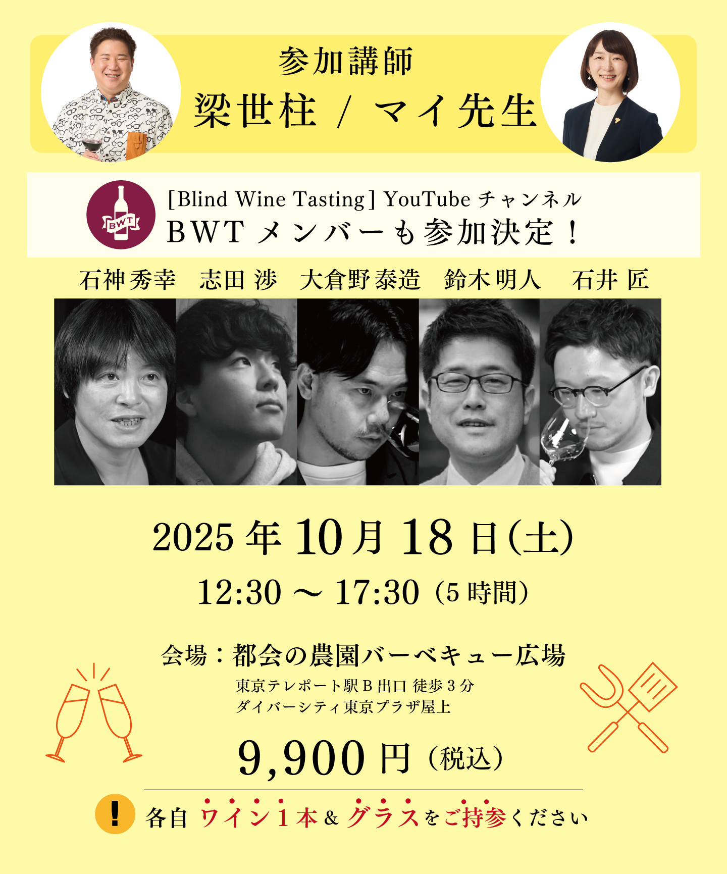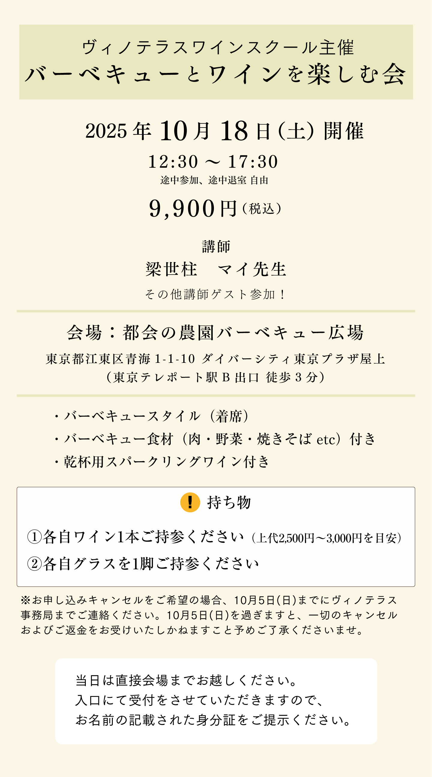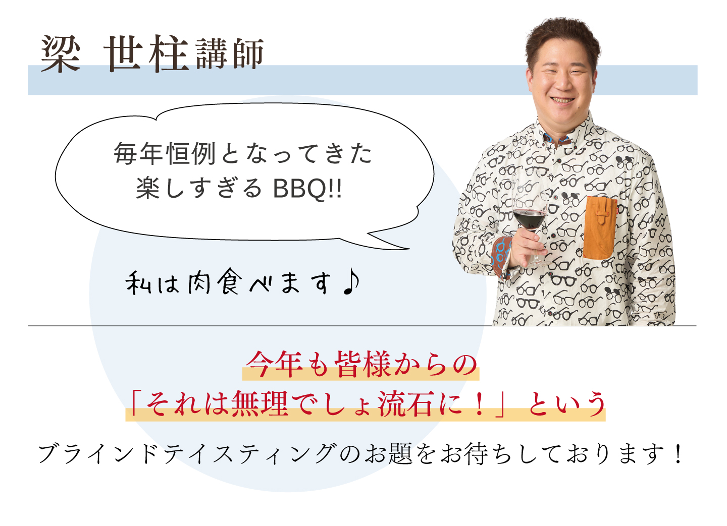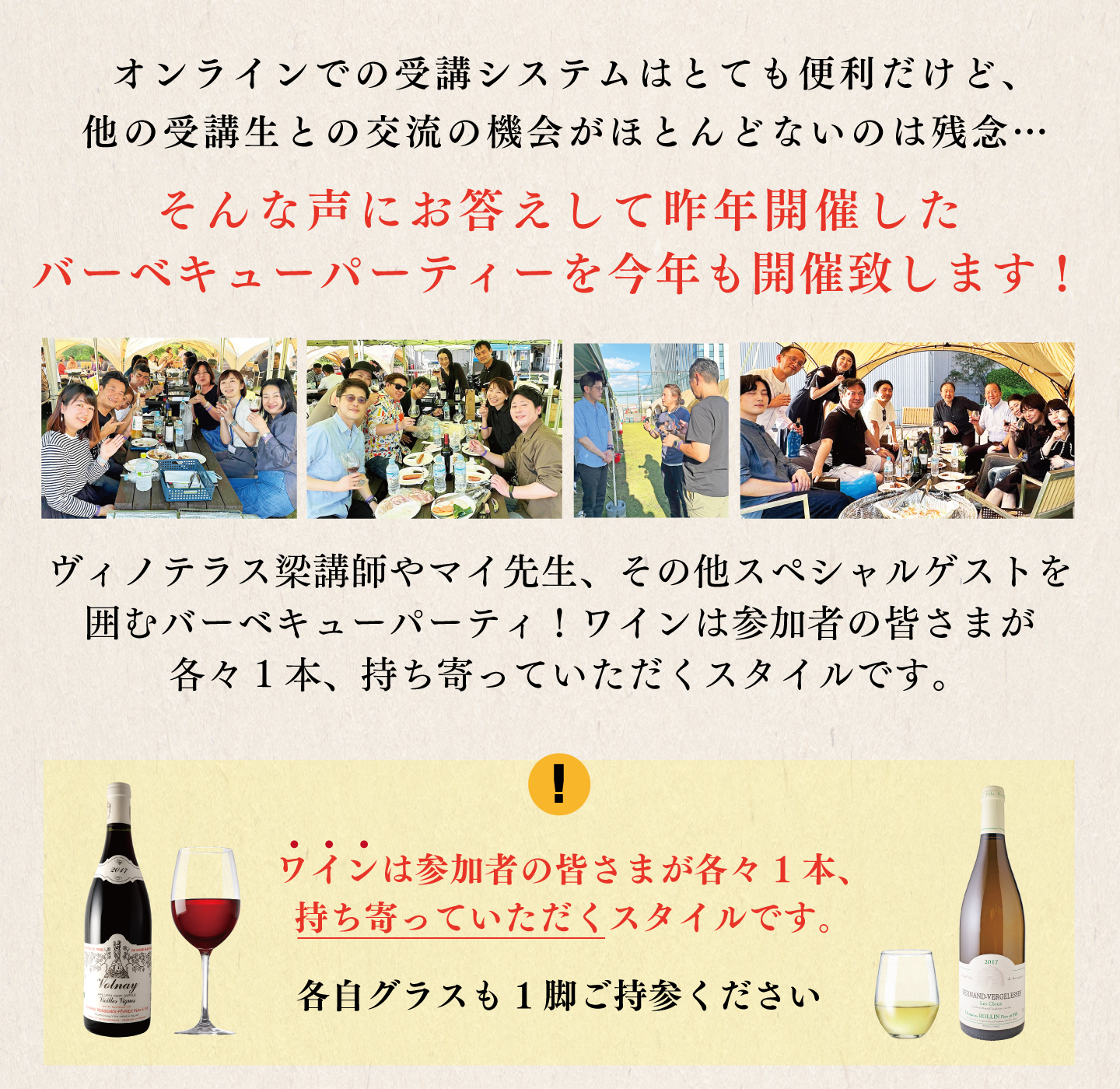 「オンラインでの受講システムはとても便利だけど、他の受講生との交流の機会がほとんどないのは残念……」そんな声にお答えして昨年開催したバーベキューパーティーを今年も開催致します!ヴィノテラスの梁 世柱講師、マイ先生その他スペシャルゲストなどを囲むバーベキューパーティ!ワインは参加者の皆さまが各々1本、持ち寄っていただくスタイルです。持ち寄ったワインに関するご質問はもちろん、講座の感想や更なる深掘り、疑問点についての質問などぜひ一緒に飲みながら気軽にお声がけください♪