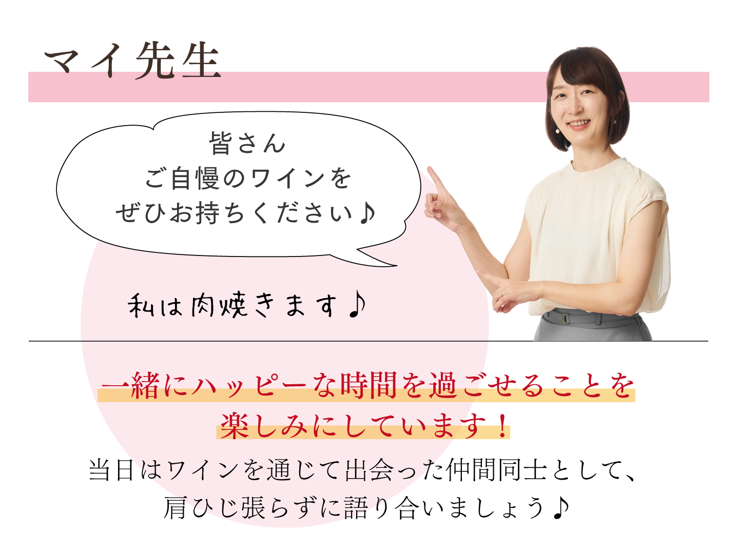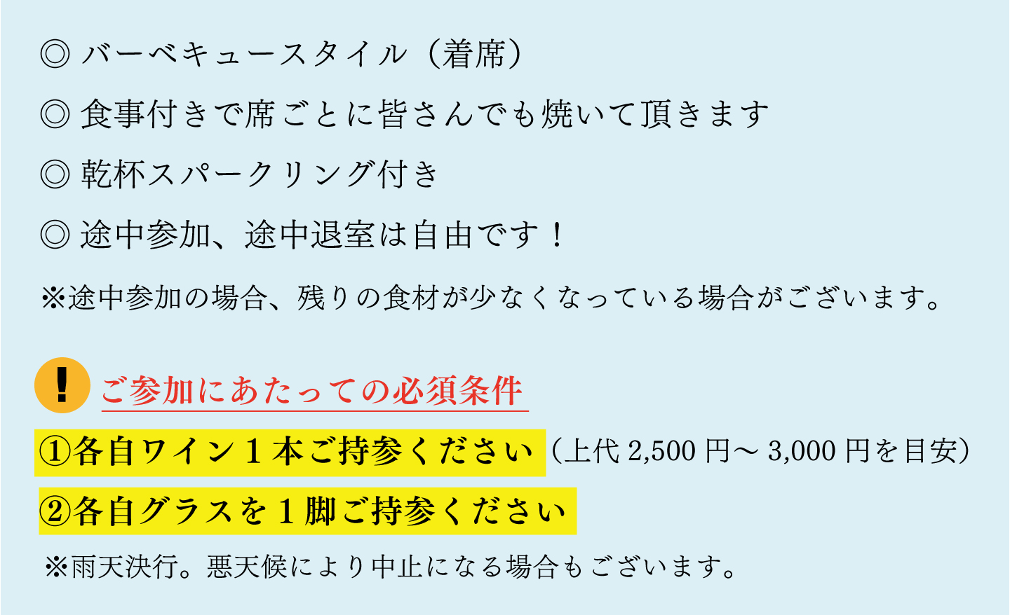 ① 各自ワイン1本ご持参ください(上代2,500円~3,000円を目安)