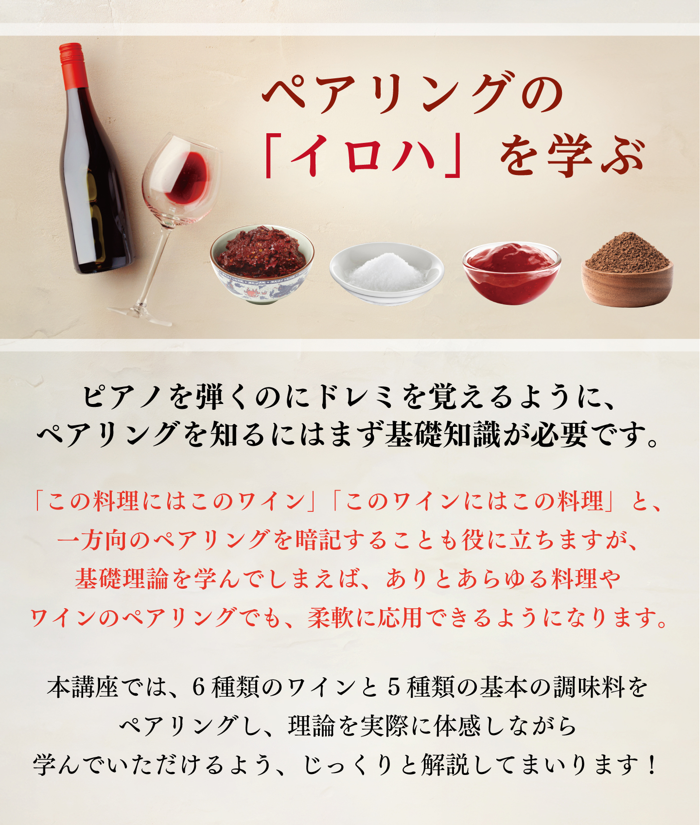 前編では、6種類のワインと5種類の基本の調味料をペアリングし、理論を実際に体感しながら学んでいただけるよう、じっくりと解説!