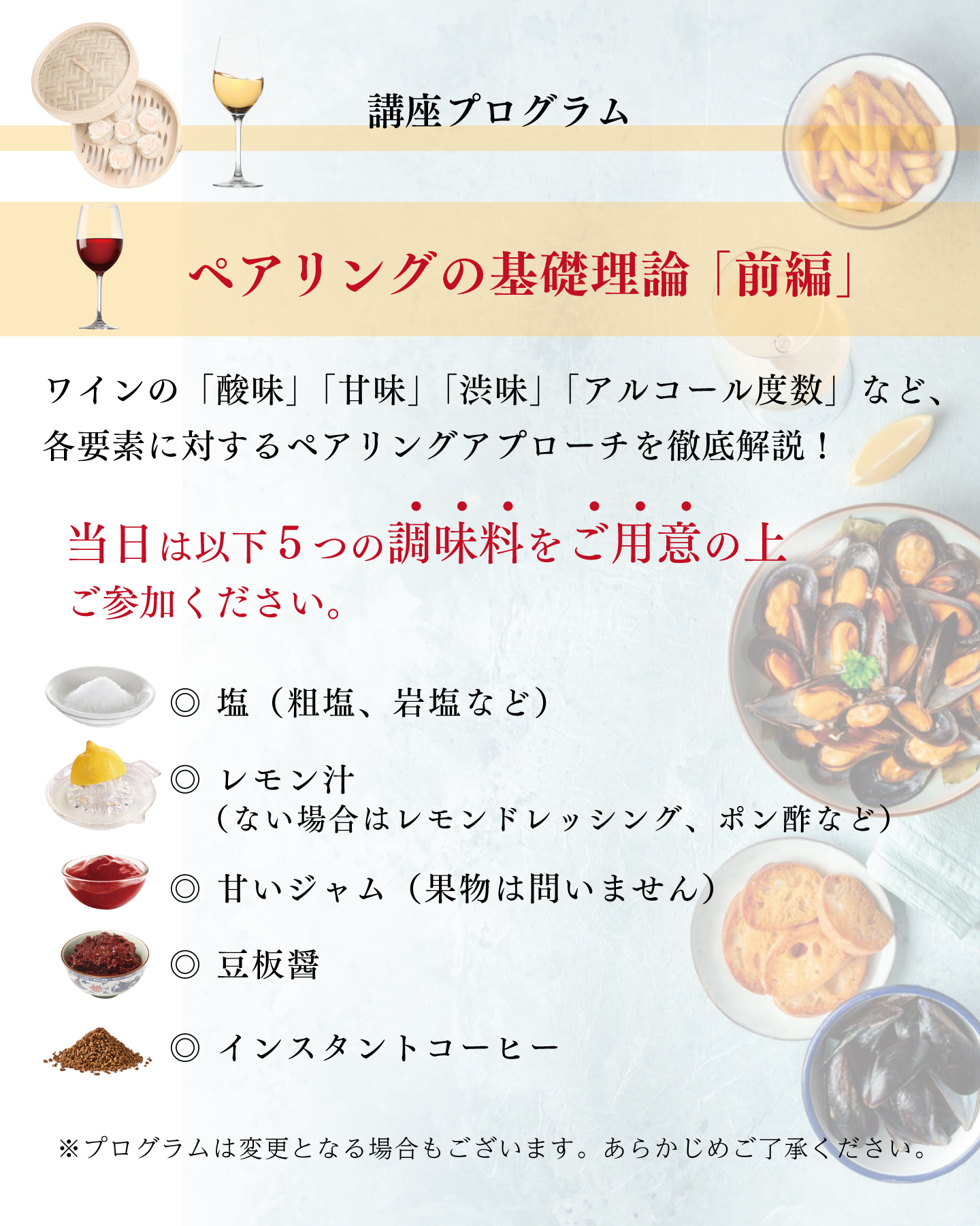 当日は以下5つの調味料をご用意の上ご参加ください。