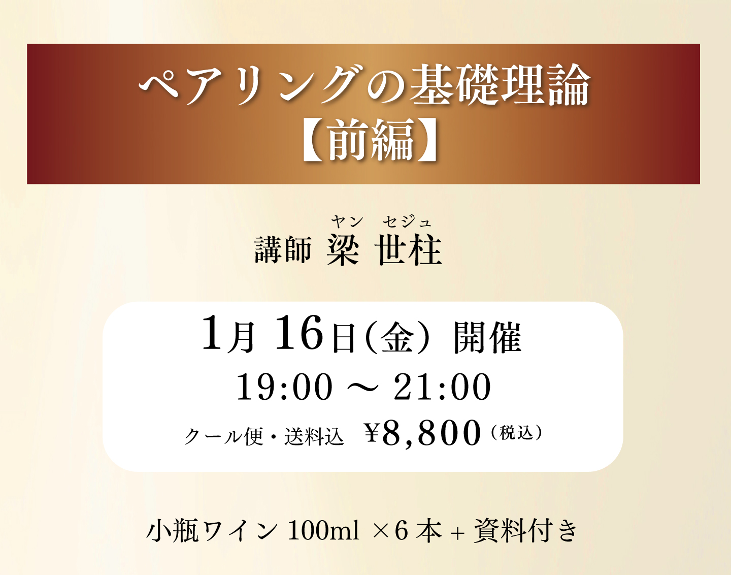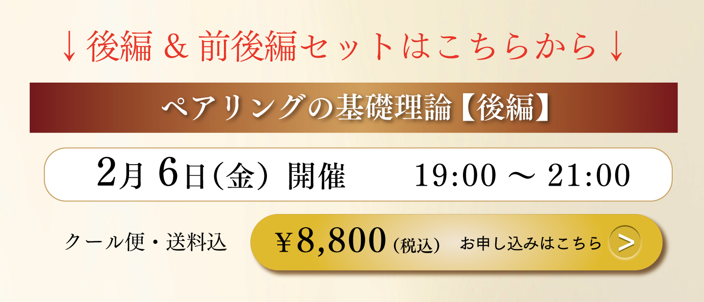後編では「肉・海鮮・野菜」に対するペアリング理論を、ギュギュっと2時間にまとめて解説いたします!ワインペアリングの更なる奥深さを、体感してみませんか。