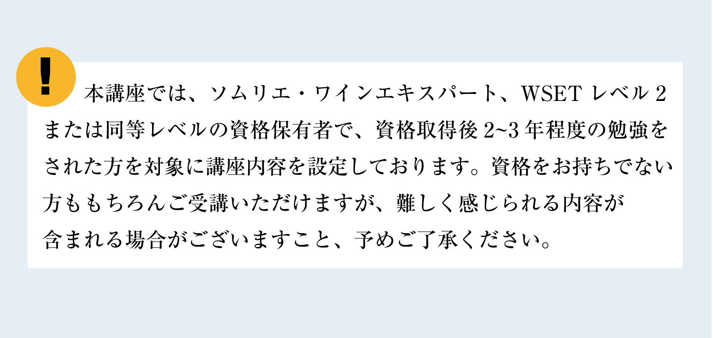 ヴィノテラスの『マスタークラス』では、「試験対策講座」や「ブラッシュアップ講座」でも踏み込めなかった「狭く・深い」ワインの世界をじっくりと解説してまいります。