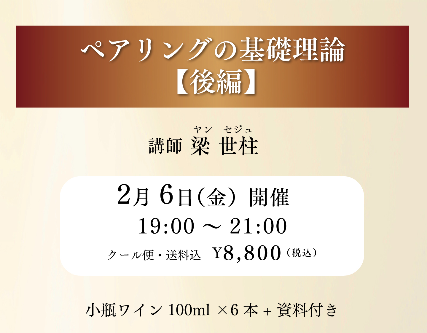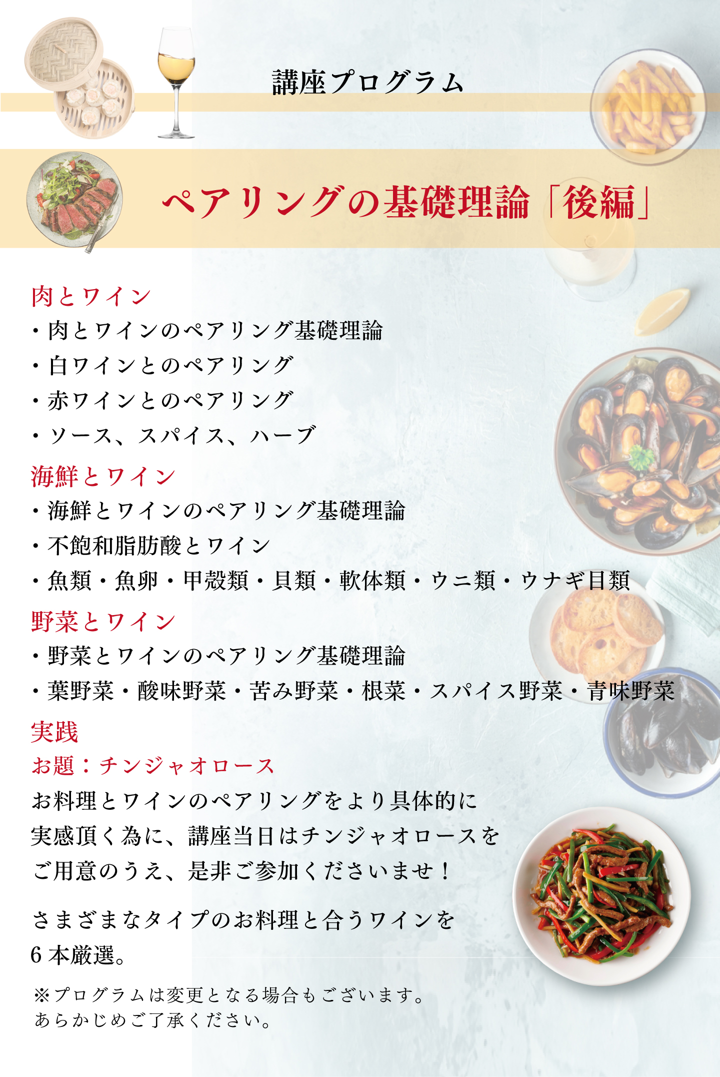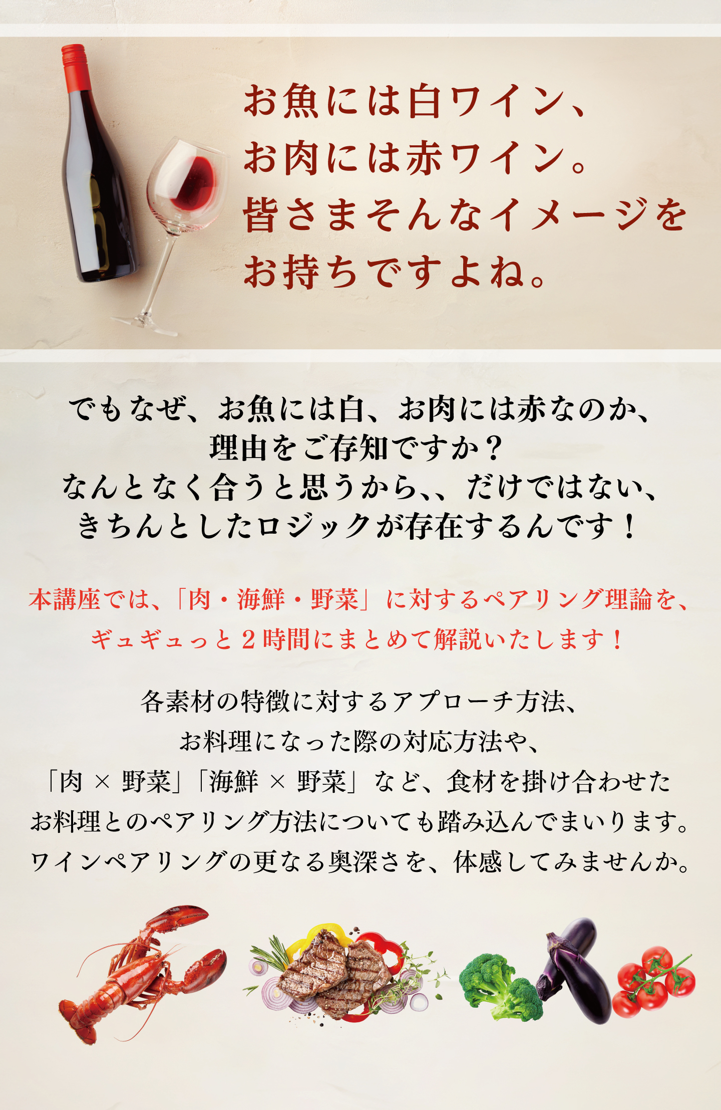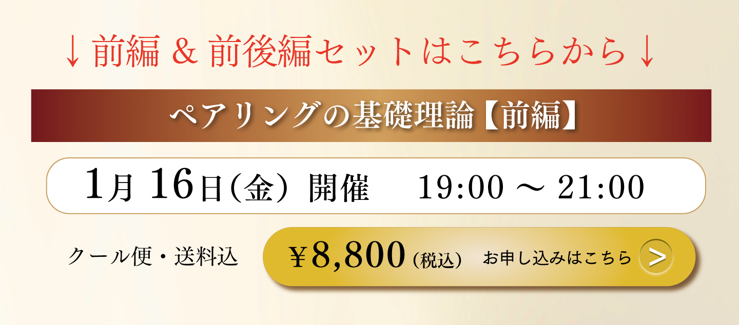 後編では「肉・海鮮・野菜」に対するペアリング理論を、ギュギュっと2時間にまとめて解説いたします!ワインペアリングの更なる奥深さを、体感してみませんか。
