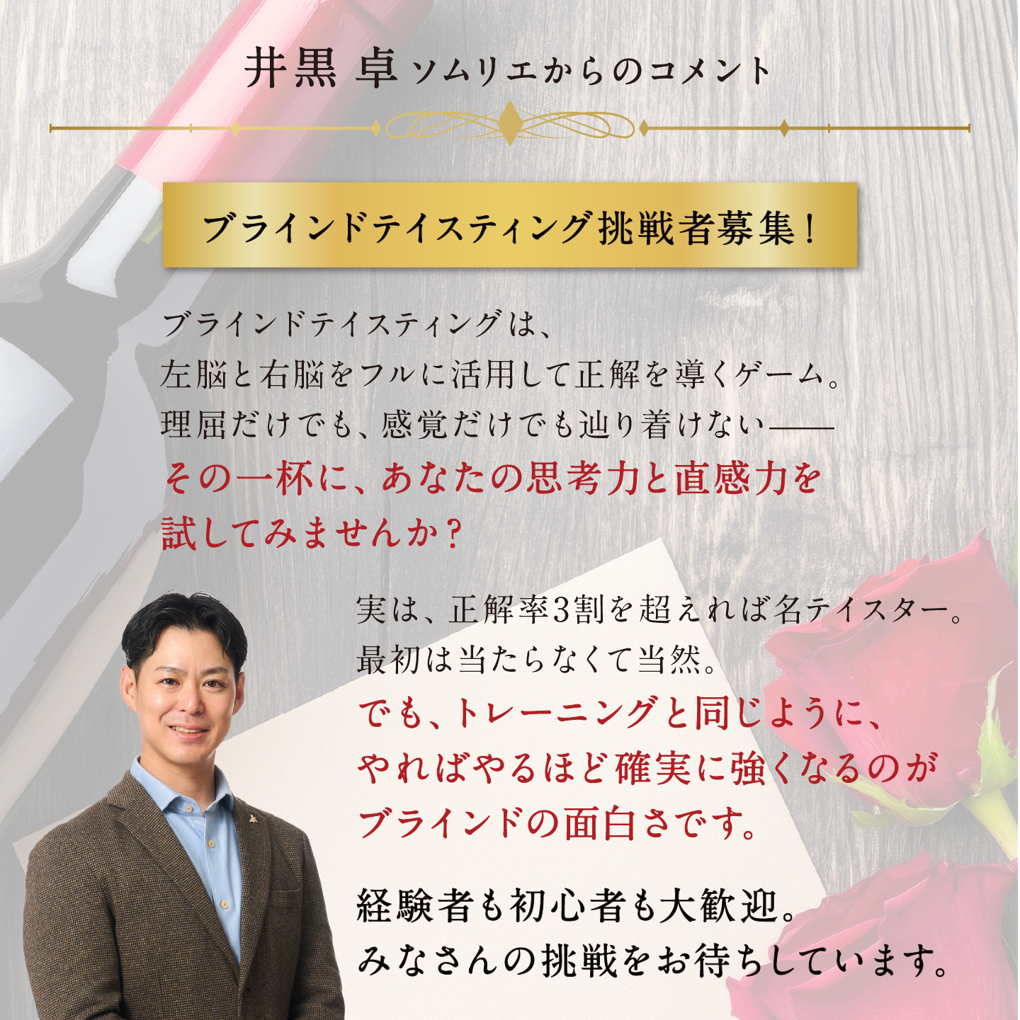 TOP 井黒ソムリエに挑戦!ブラインドテイスティング真剣勝負! 【3月15日(日)開催】 第1回ブラインドテイスティング白編 価格: ¥9,900 (税込) [ポイント還元 495ポイント~] 販売期間: 数量: セット 在庫: 在庫あり 在庫 在庫あり 返品についての詳細はこちら 【3月15日(日)開催】 第1回ブラインドテイスティング白編