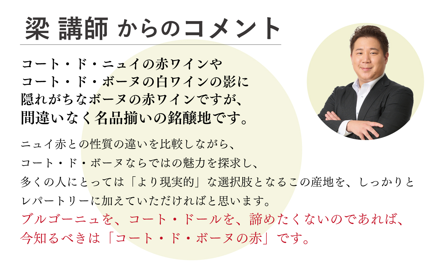 ニュイ赤との性質の違いを比較しながら、コート・ド・ボーヌならではの魅力を探求し、多くの人にとっては「より現実的」な選択肢となるこの産地を、しっかりとレパートリーに加えていただければと思います。ブルゴーニュを、コート・ドールを、諦めたくないのであれば、今知るべきは「コート・ド・ボーヌの赤」です。