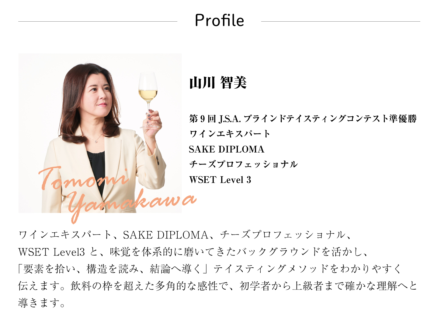 ワインエキスパート、SAKE DIPLOMA、チーズプロフェッショナル、WSET Level3 と、味覚を体系的に磨いてきたバックグラウンドを活かし、「要素を拾い、構造を読み、結論へ導く」テイスティングメソッドをわかりやすく伝えます。飲料の枠を超えた多角的な感性で、初学者から上級者まで確かな理解へと導きます。
