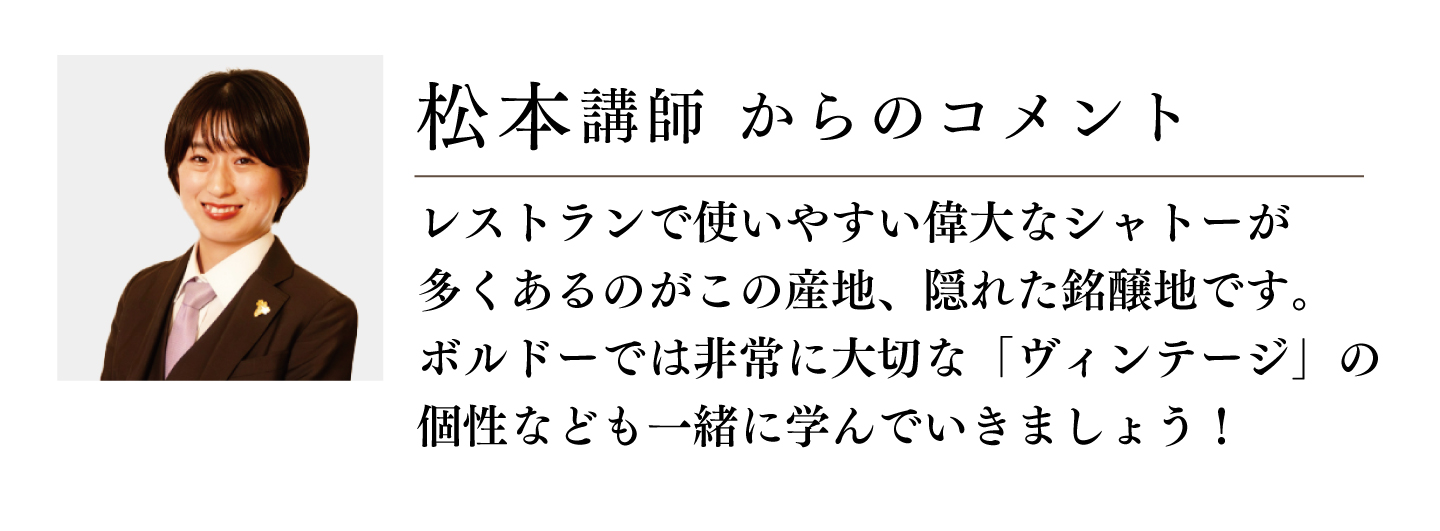 レストランで使いやすい偉大なシャトーが多くあるのがこの産地、隠れた銘醸地です。ボルドーでは非常に大切な「ヴィンテージ」の個性なども一緒に学んでいきましょう!