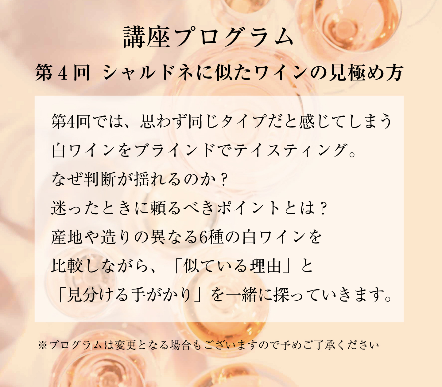 思わず同じタイプだと感じてしまう白ワインをブラインドでテイスティング。なぜ判断が揺れるのか?迷ったときに頼るべきポイントとは?産地や造りの異なる6種の白ワインを比較しながら、「似ている理由」と「見分ける手がかり」を一緒に探っていきます。