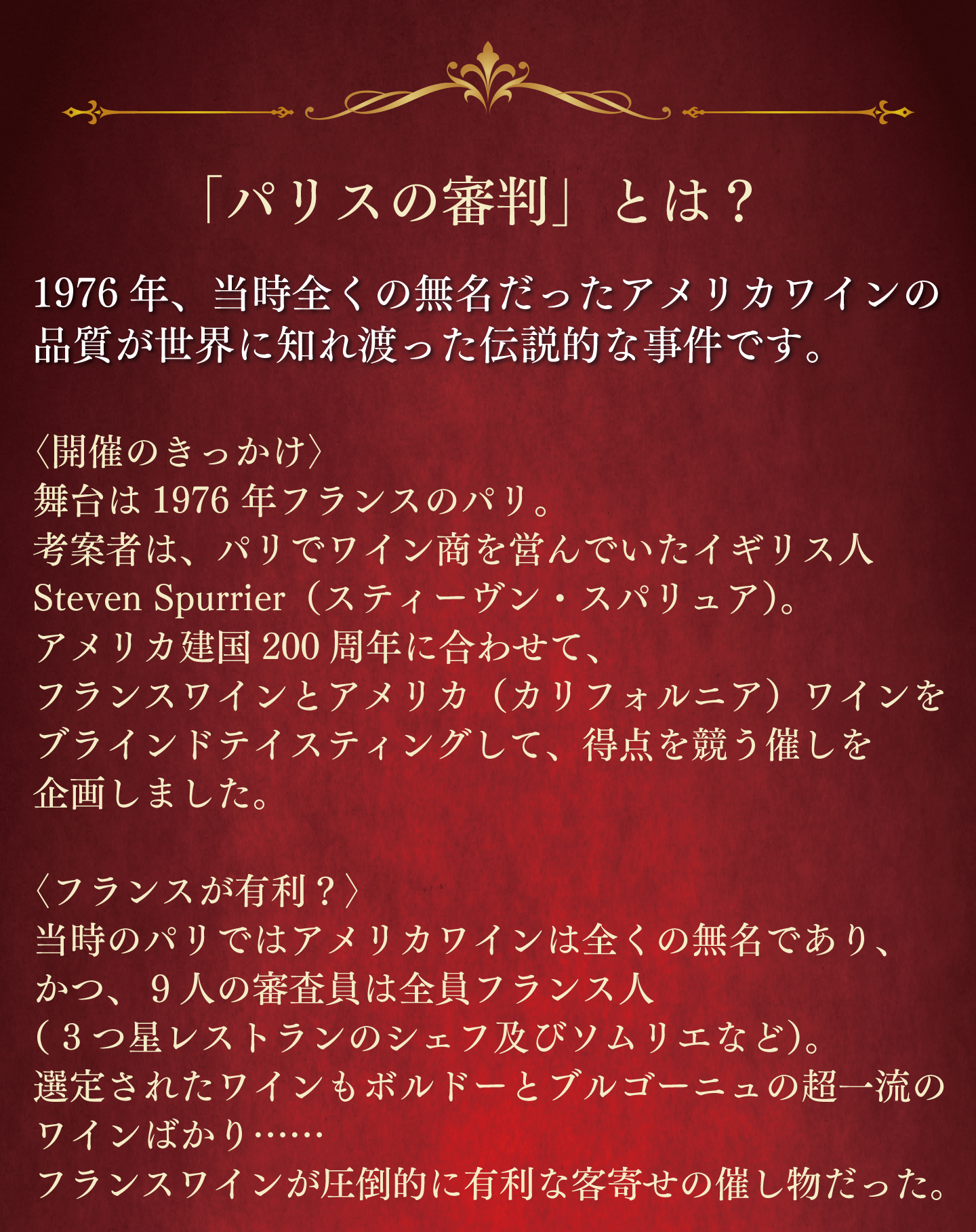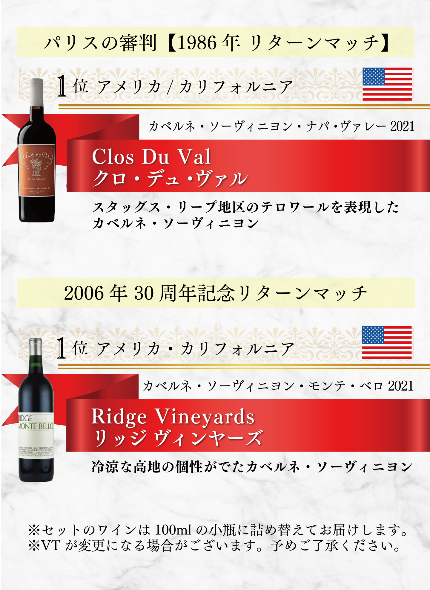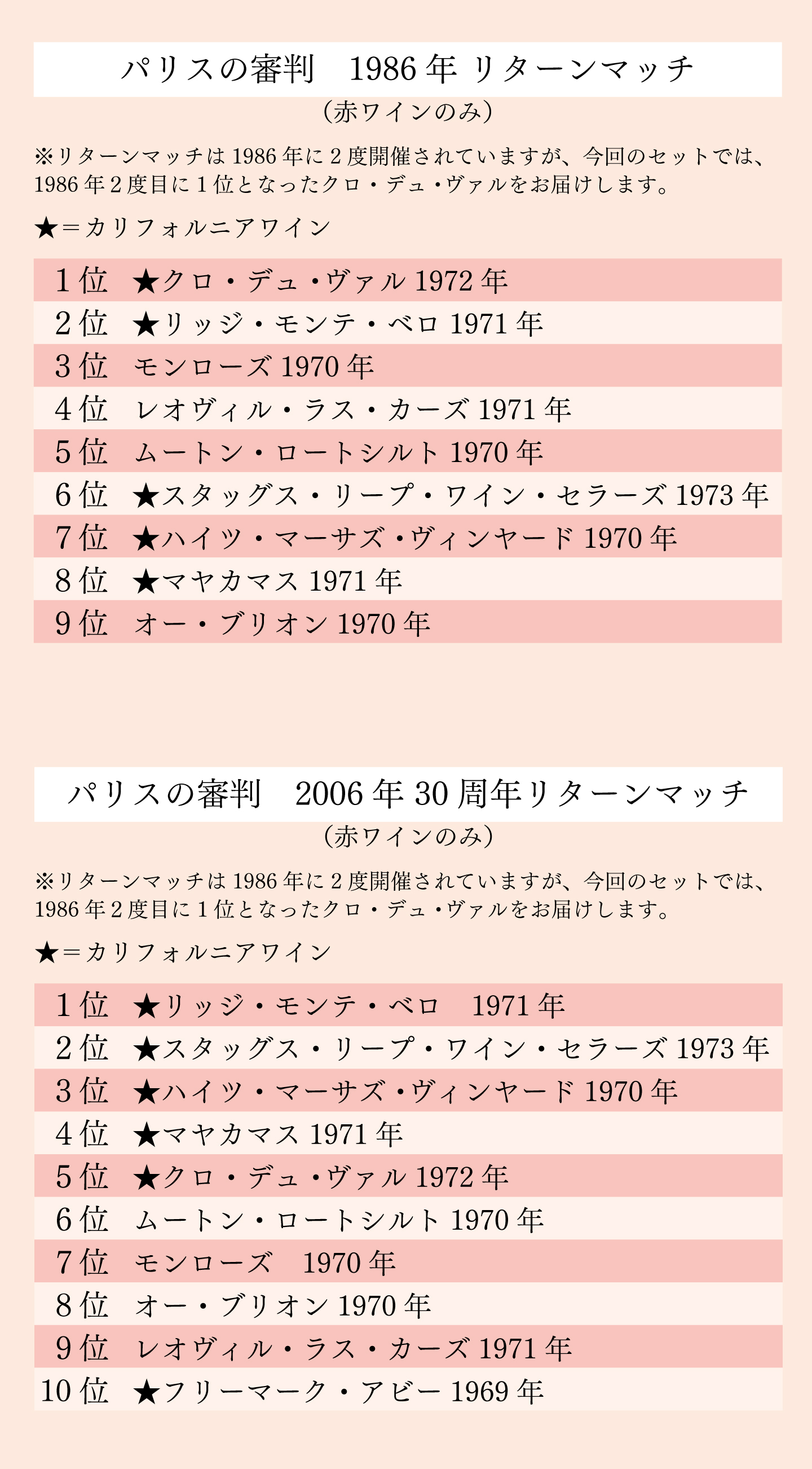 TOP ワインセット一覧 パリスの審判 6本セット 価格: ¥52,800 (税込) [ポイント還元 2,640ポイント~] 販売期間: 数量: セット 在庫: 在庫切れ 在庫 在庫切れ 返品についての詳細はこちら パリスの審判 6本セット お申し込みはこちらから