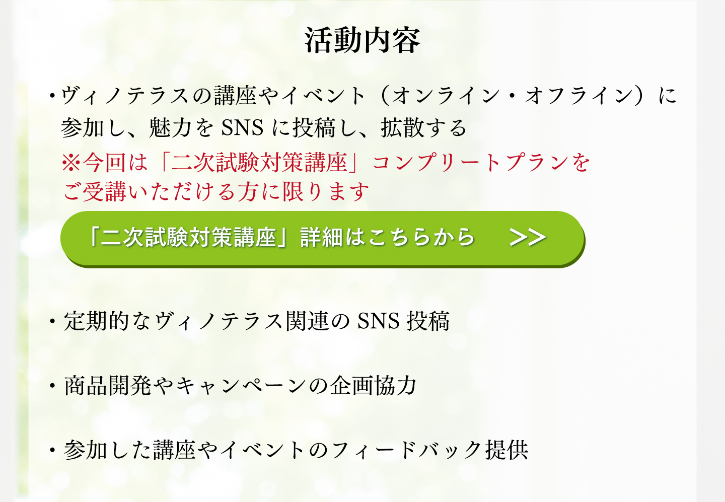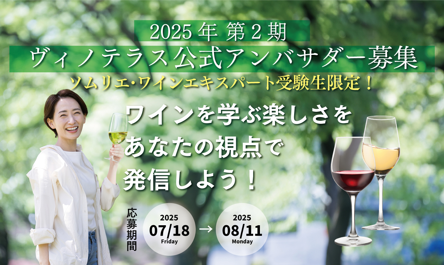 「ソムリエ・ワインエキスパート二次試験対策講座」に特化したアンバサダーを募集します!一緒にワインを学ぶ楽しさを広め、ヴィノテラスを盛り上げてくださる方をお待ちしています!受験生の皆さまのご応募を心よりお待ちいたしております!