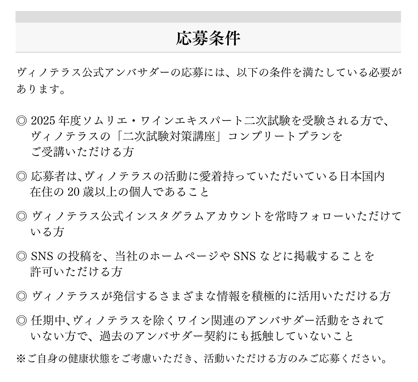 ヴィノテラス公式アンバサダーの応募には、以下の条件を満たしている必要が